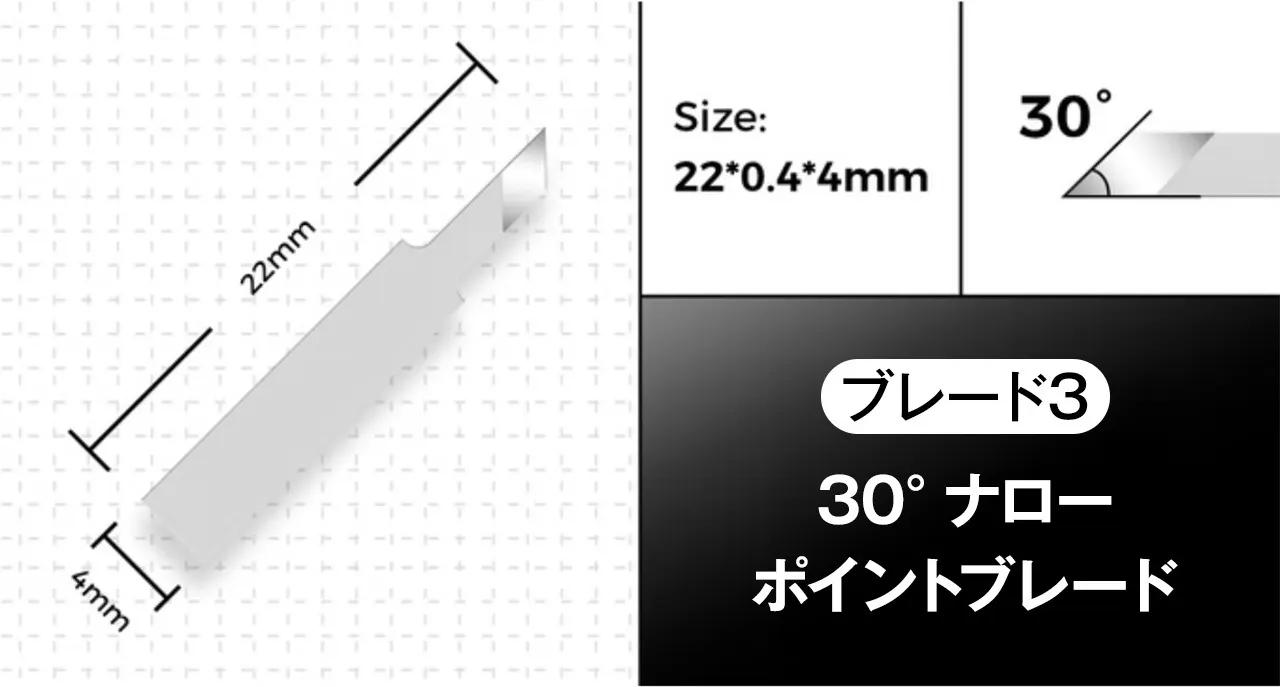 ブレードは独自開発した22mm 30°フラットボトムのシングルポイントブレードで高い切断効率。