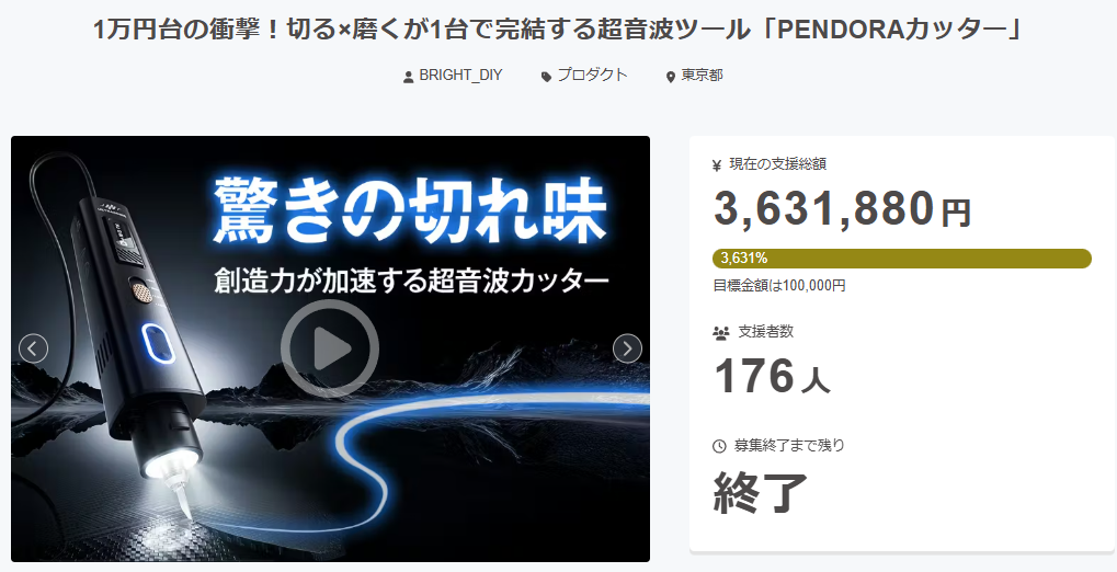 ご支援者様、1万円台の衝撃!切る×磨くが1台で完結する超音波ツール「PENDORAカッター」にご興味をお持ちいただきありがとうございます。プロジェクト開始から35日目で176人ものご支援者の方々より支援頂き、無事プロジェクト終了を迎えることが出来ました。早速皆様のリターンを2026年04月末にお届けできるよう準備を始めております!皆様にご満足いただけるリターンをお届けできるよう、全力で取り組んで参りますので引き続き、「1万円台の衝撃!切る×磨くが1台で完結する超音波ツール「PENDORAカッター」」をよろしくお願い致します。BRIGHTチーム