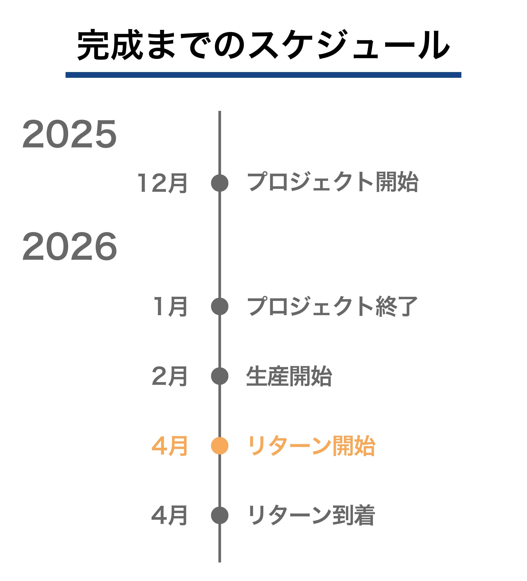 ※本文中に記載させていただいたスケジュールは、あくまでプロジェクト公開時点の予定です。クラウドファンディングを経て輸入を行う性質上、配送遅延のおそれがございます。