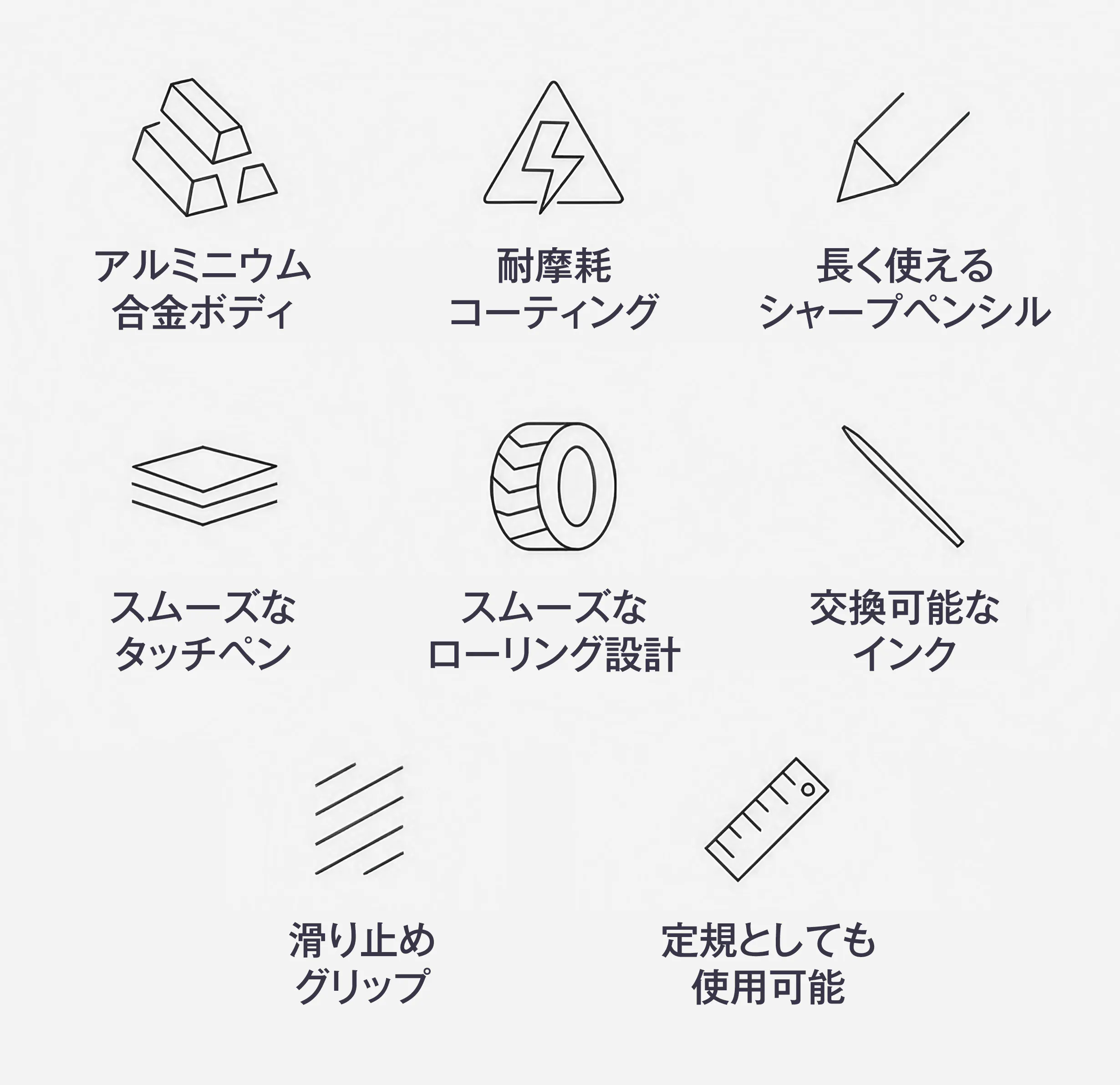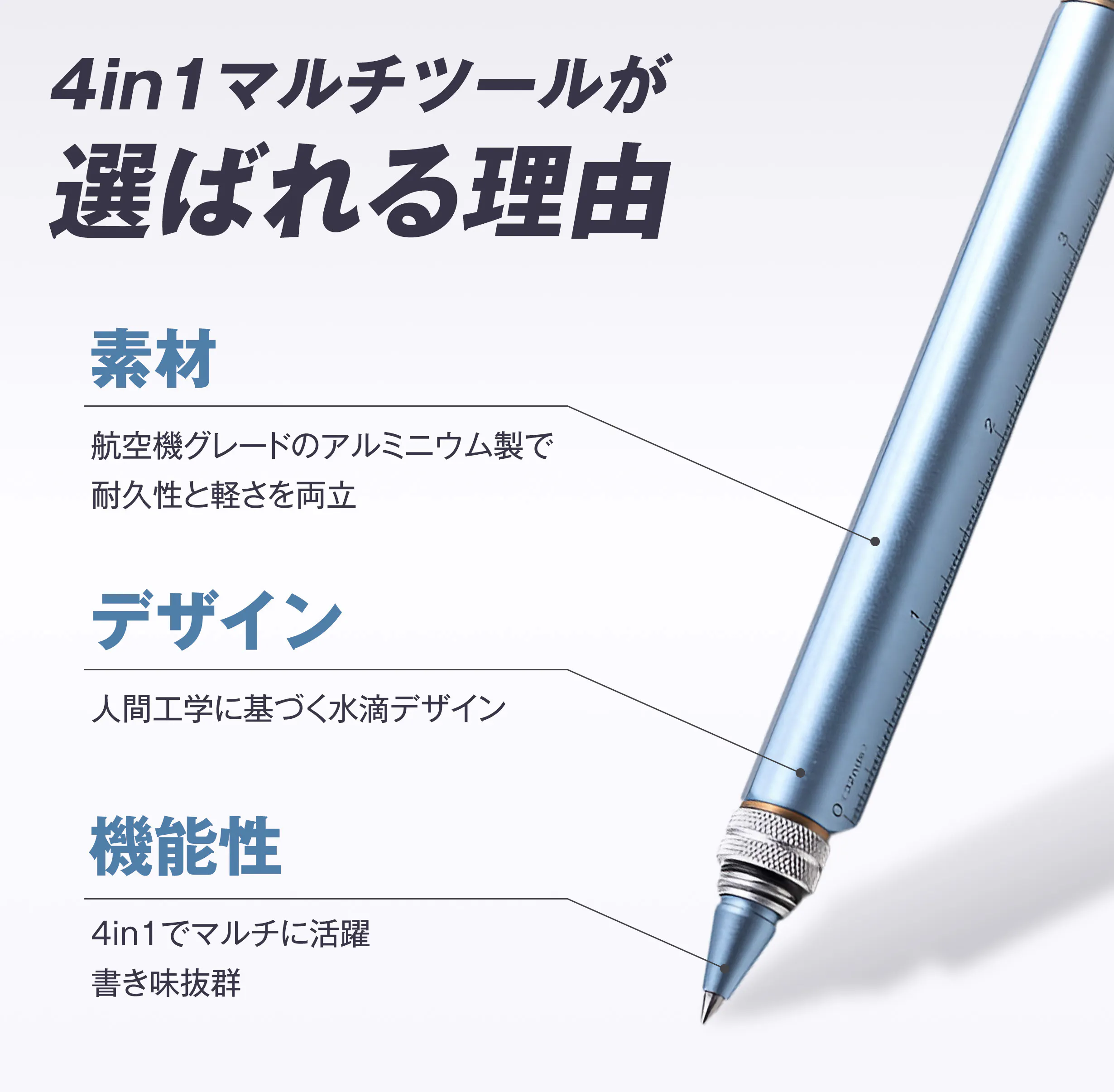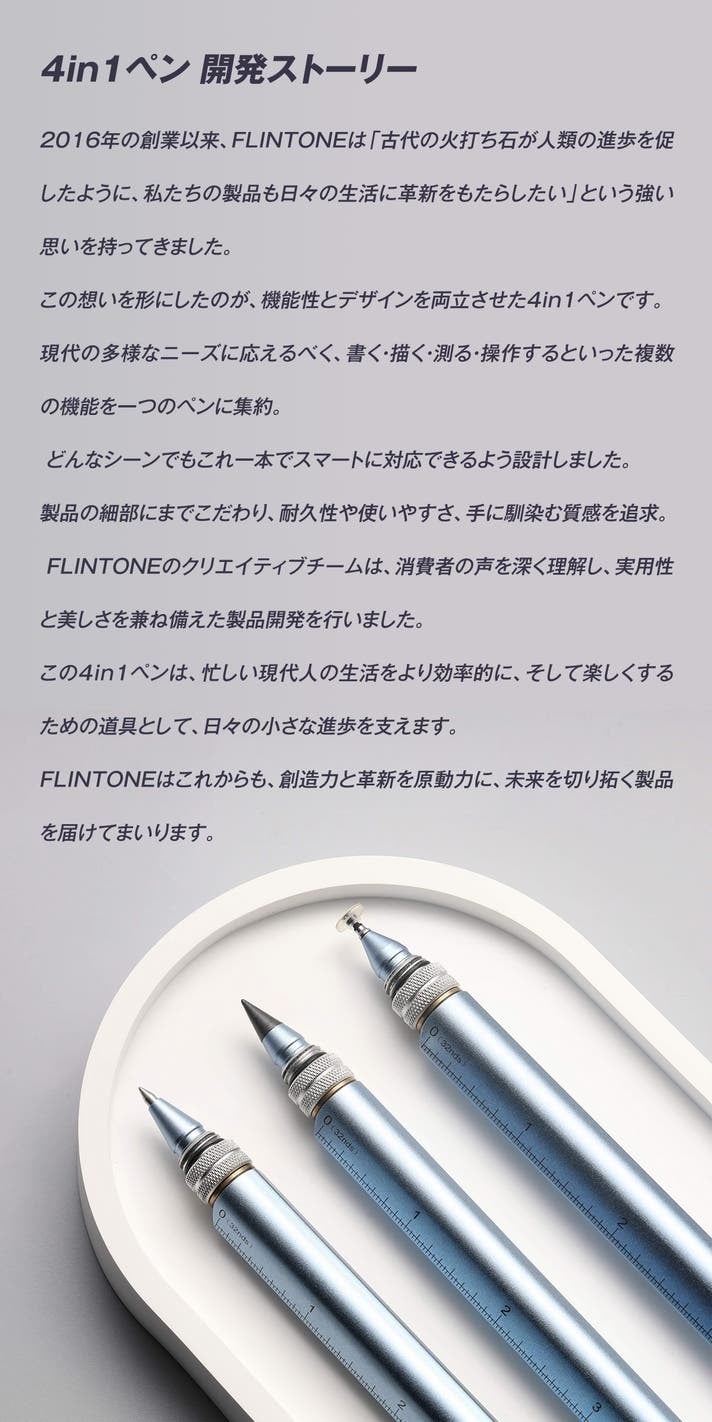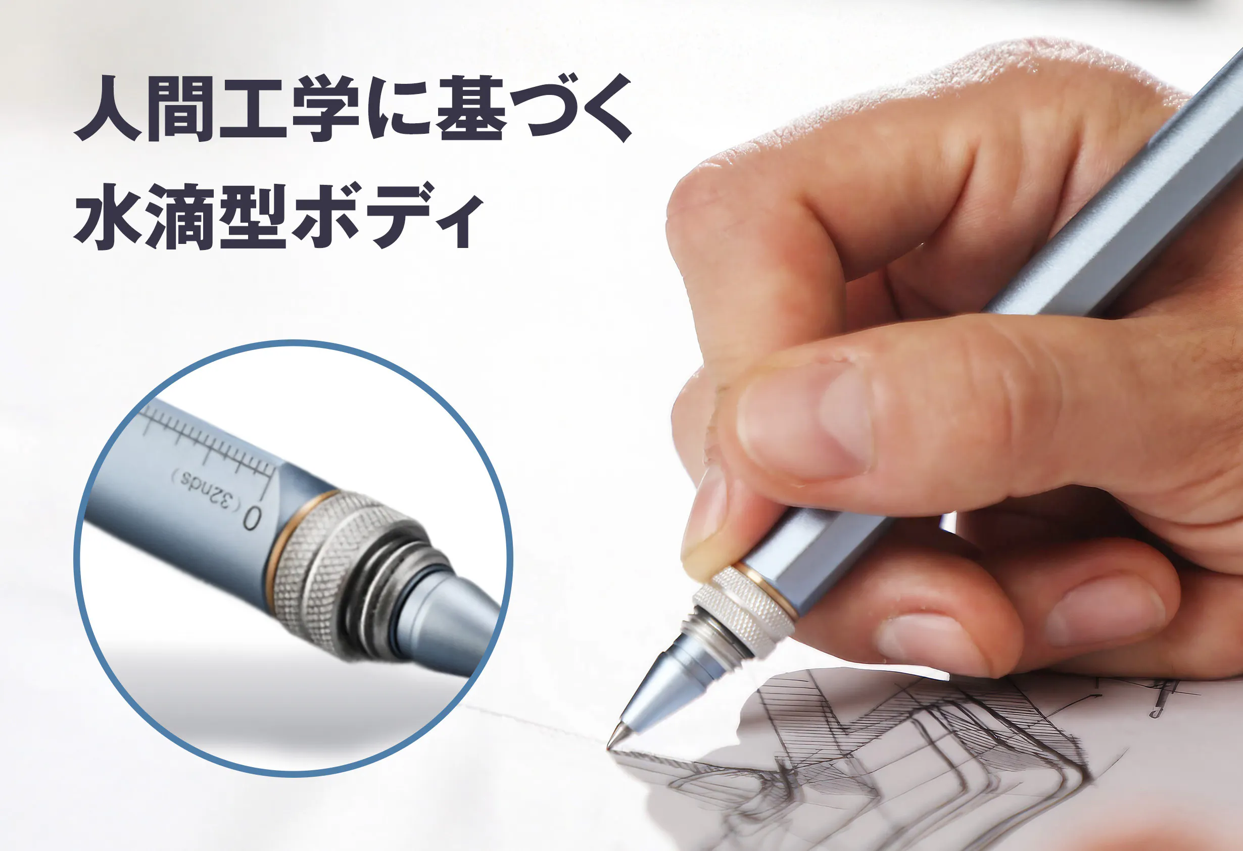 現代の多様なニーズに応えるべく、書く・描く・測る・操作するといった複数の機能を一つのペンに集約。3000時間以上の試行錯誤を繰り返し、開発。どんなシーンでもこれ一本でスマートに対応できるよう設計しました。