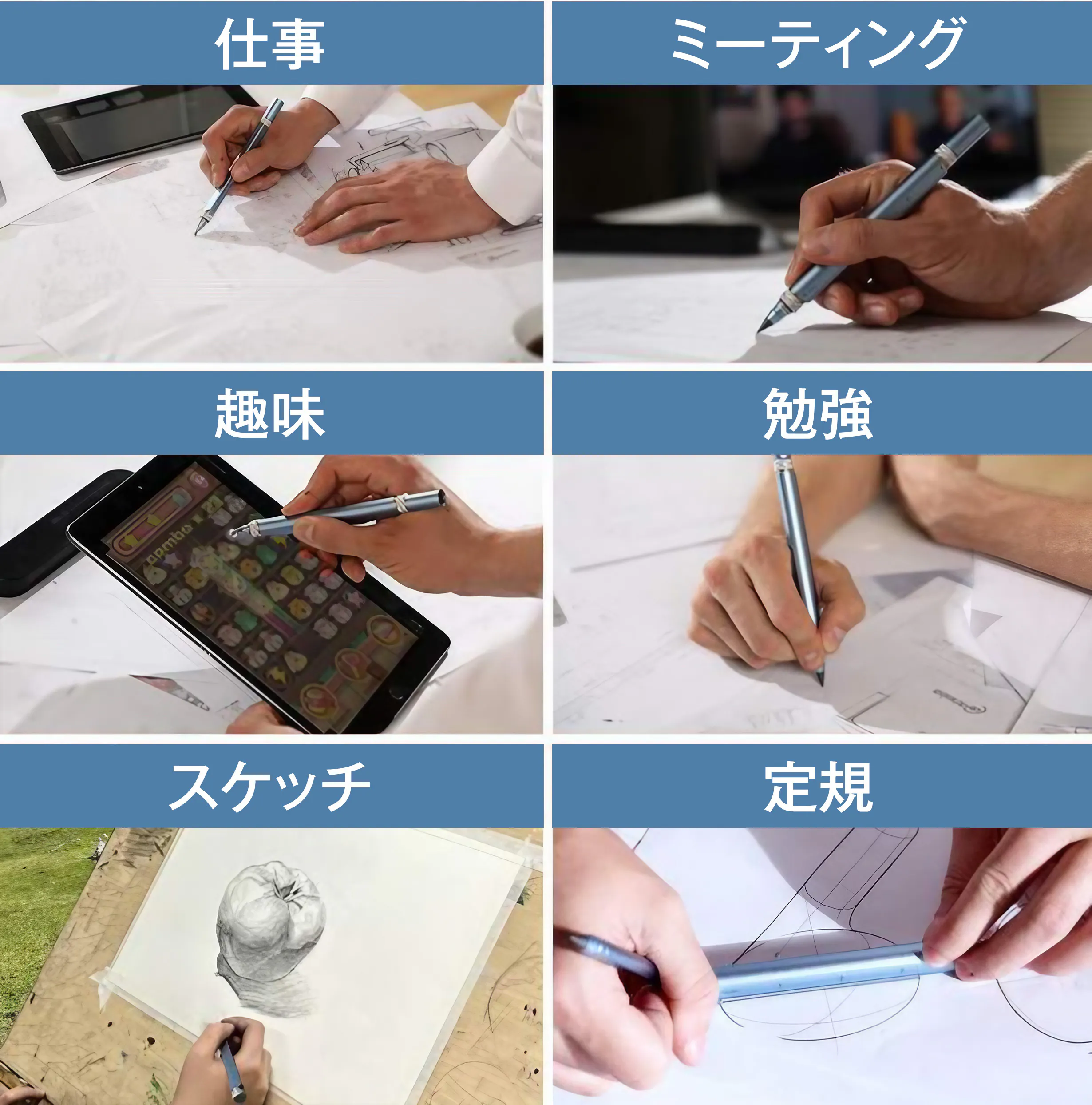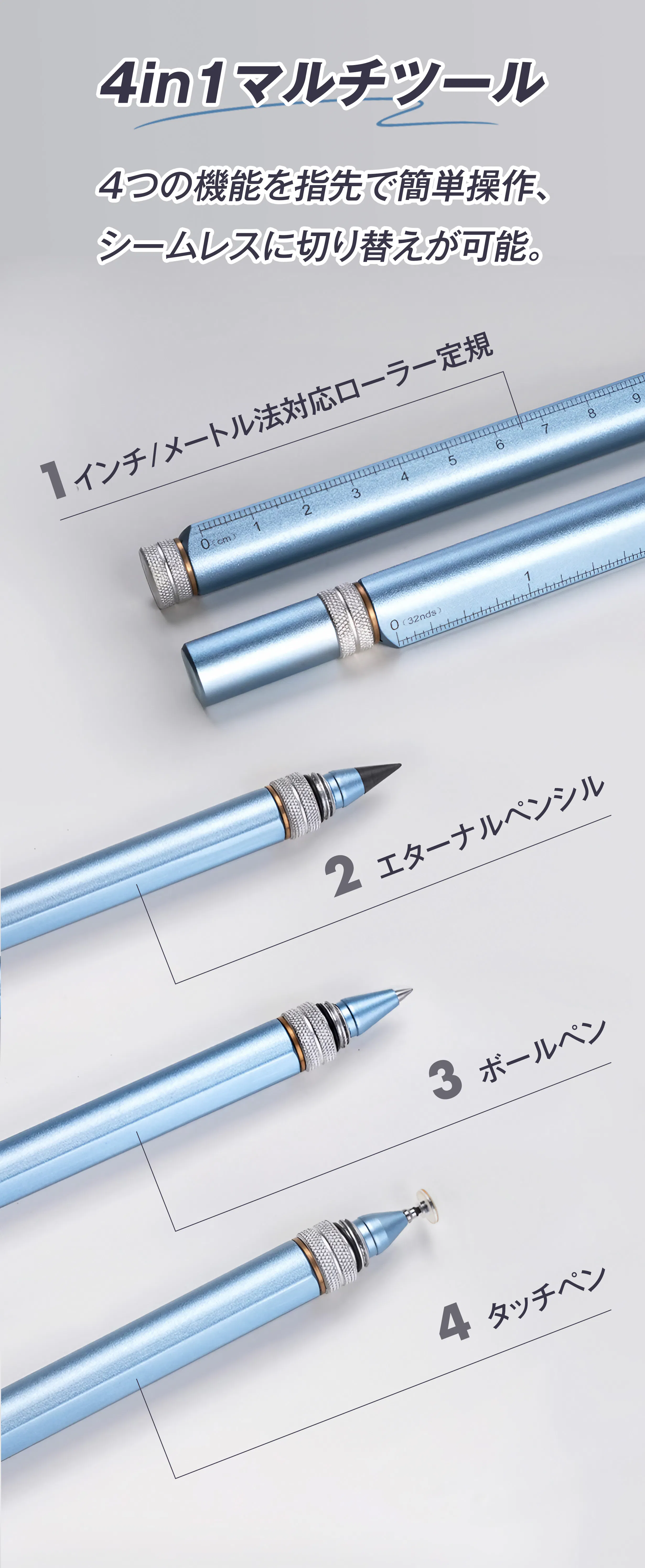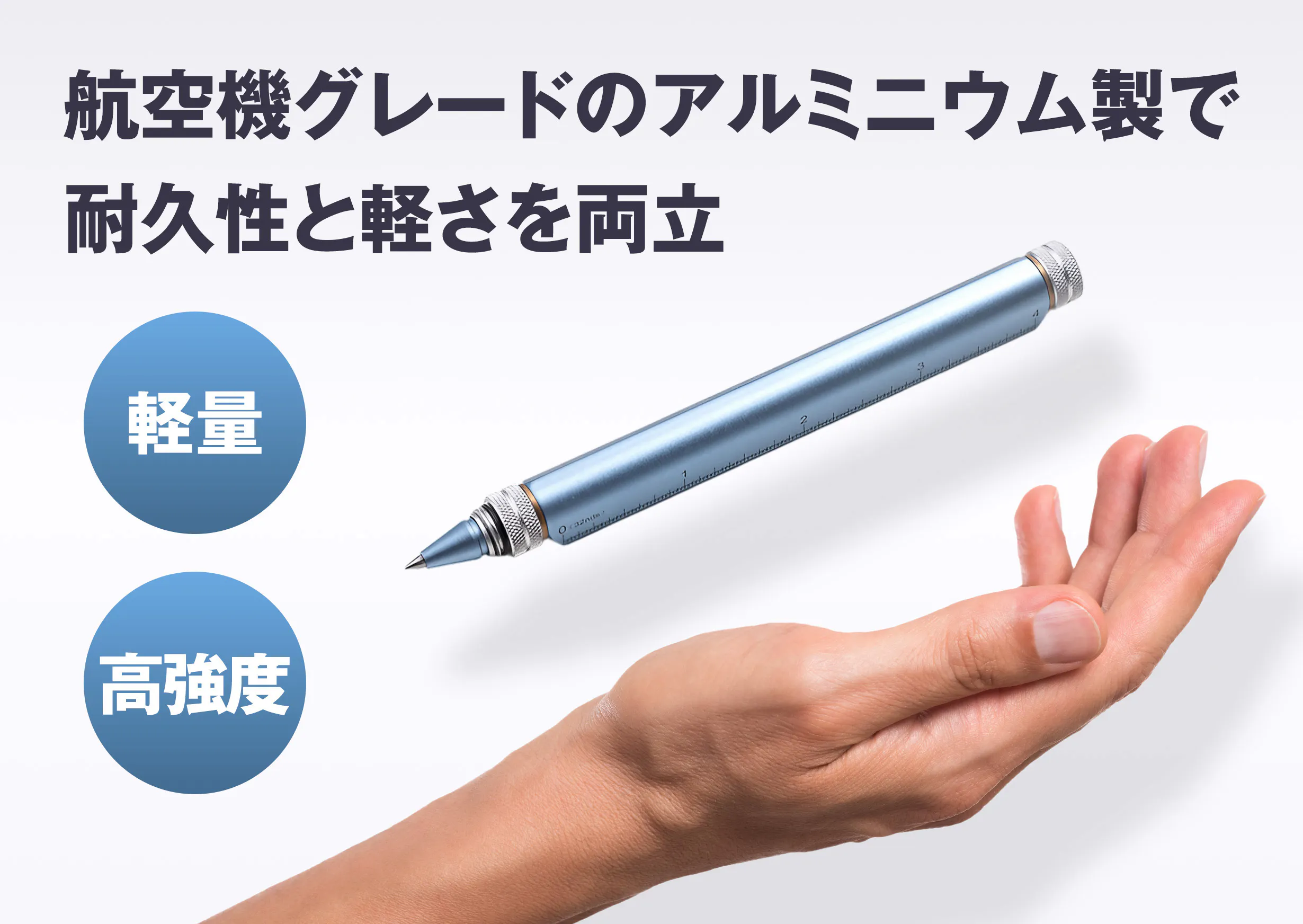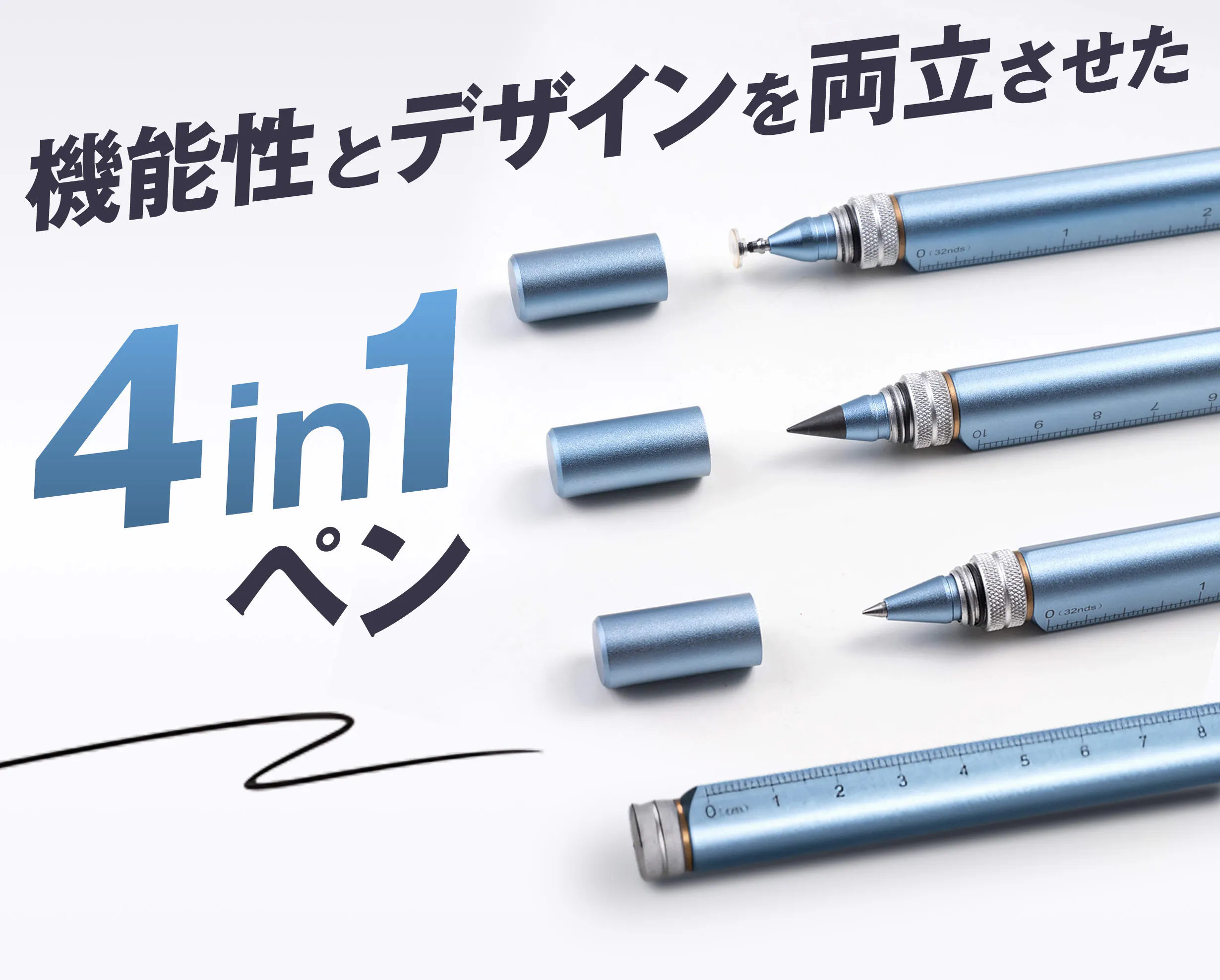 現代の多様なニーズに応えるべく、書く・描く・測る・操作するといった複数の機能を一つのペンに集約。3000時間以上の試行錯誤を繰り返し、開発。どんなシーンでもこれ一本でスマートに対応できるよう設計しました。