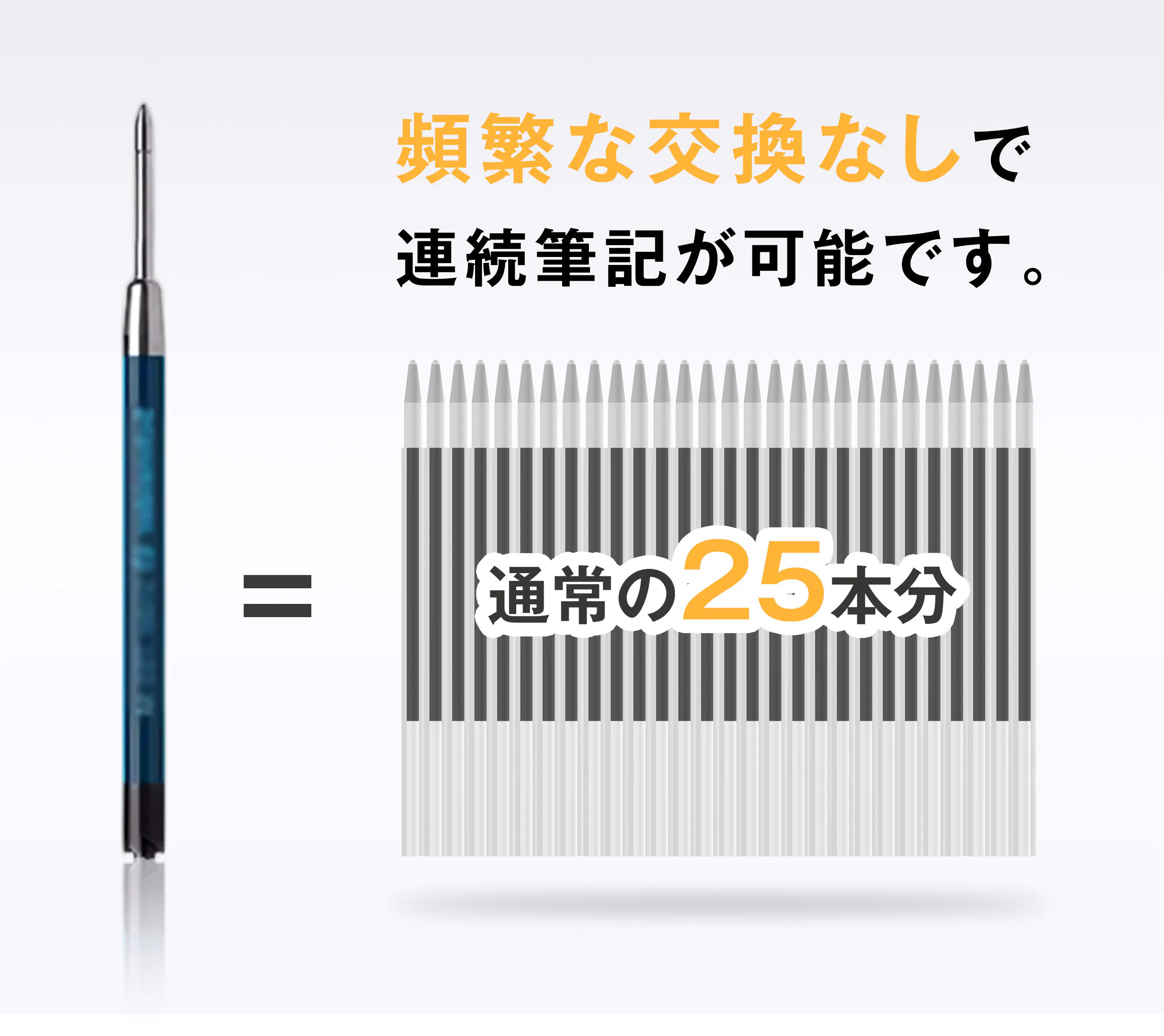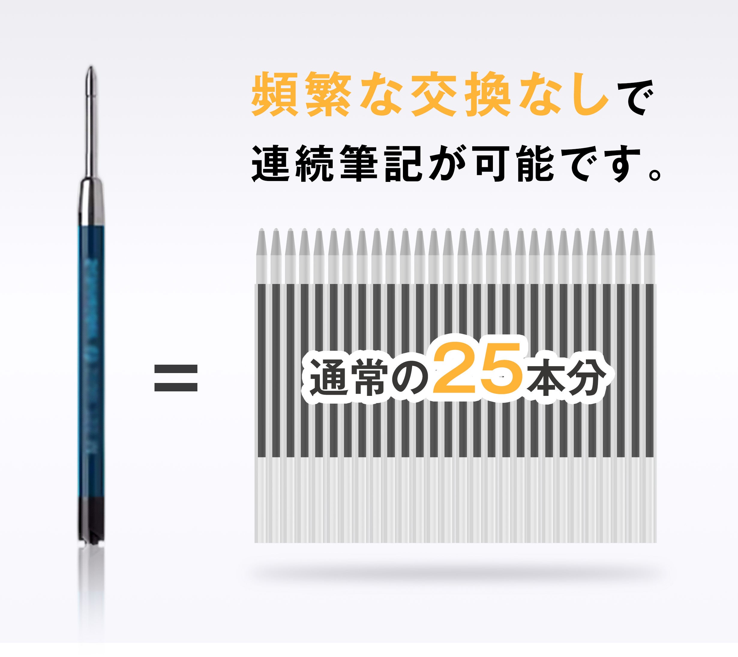 長時間の使用を考慮して設計されており、1回のリフィルで通常の25本分に相当。頻繁な交換なしで連続筆記が可能です。
