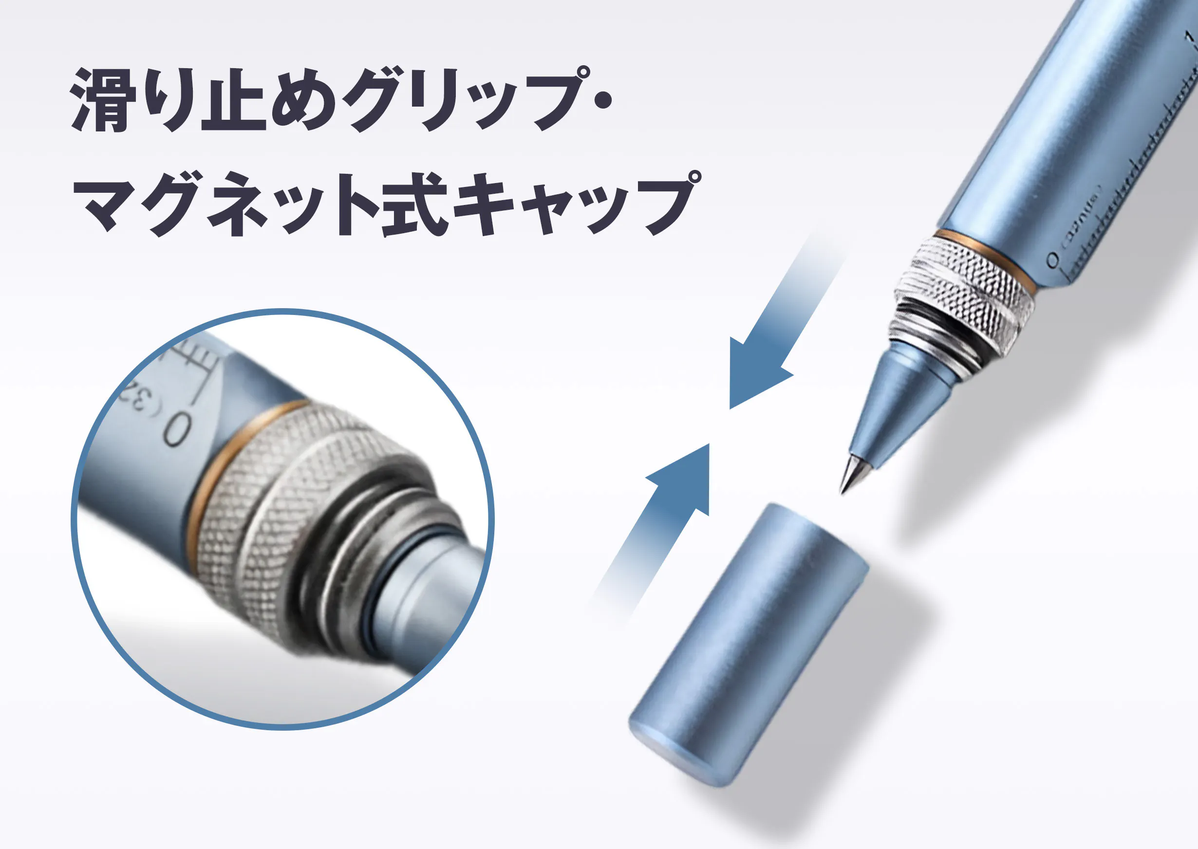 特殊加工の滑り止めグリップが安定した筆記をサポート。マグネット式キャップはしっかり固定でき、紛失を防ぎます。