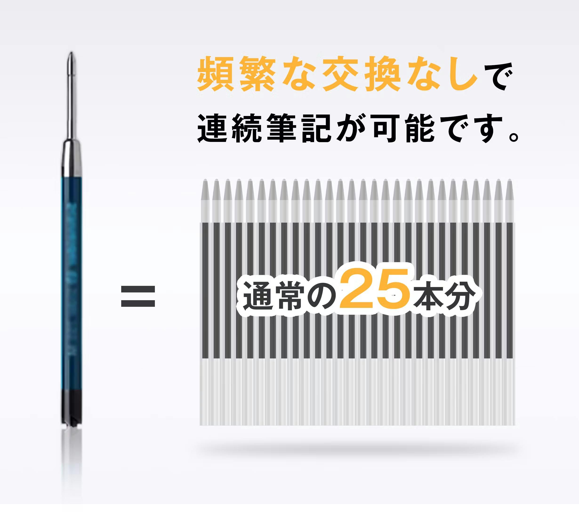 G2規格のボールペンリフィルは、一般的なボールペン25本分相当の筆記量を誇ります。つまり、1本のリフィルで長期間使い続けられるため、頻繁なインク交換の手間もなく、コストパフォーマンスも非常に高いのが特長です。これは、長時間にわたる会議、授業、講義メモ、ノート取り、あるいは出張先での使用など、「たくさん書く」ことが日常の方にとっては大きな利点です。