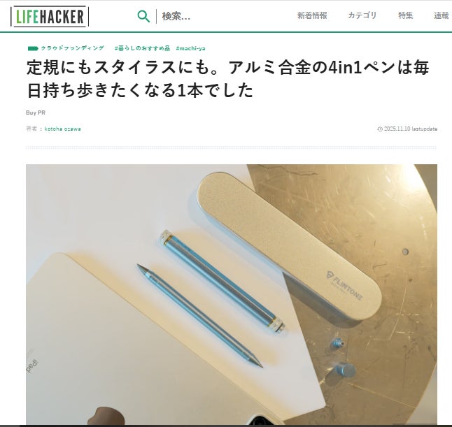 皆様、こんばんは!Brightチームです。11月10日、Lifehackerで「FLINTONE 4in1 ペン 第2弾」を紹介して頂きました。話題:定規にもスタイラスにも。アルミ合金の4in1ペンは毎日持ち歩きたくなる1本でした興味がある方、是非下記のリンクからアクセスしてみてください。https://www.lifehacker.jp/article/machi-ya-flintone-review-877824/【レビューの一部抜粋】〈交換・入れ替えで4機能こちらが定規・ボールペン・スタイラス・削り不要エターナル鉛筆が使い分けられる「FLINTONE 4in1マルチペン」。外側が定規機能を備えており、ボールペンとエターナル鉛筆は内側のペンを逆さまにして使う仕組み。スタイラスは磁石式のキャップになっているのでサッと脱着可能。考えがまとまらないときなど、ついつい遊んでしまいそうなギミックかも。〉ご興味のある方はこの機会をお見逃しなく!https://camp-fire.jp/projects/877824/view11月30日まで販売期間は続きますので、ぜひSNSでのシェアや身近な方にもおすすめしていただけると嬉しく思います。#brightdiyどうぞよろしくお願い致します。BRIGHTチーム