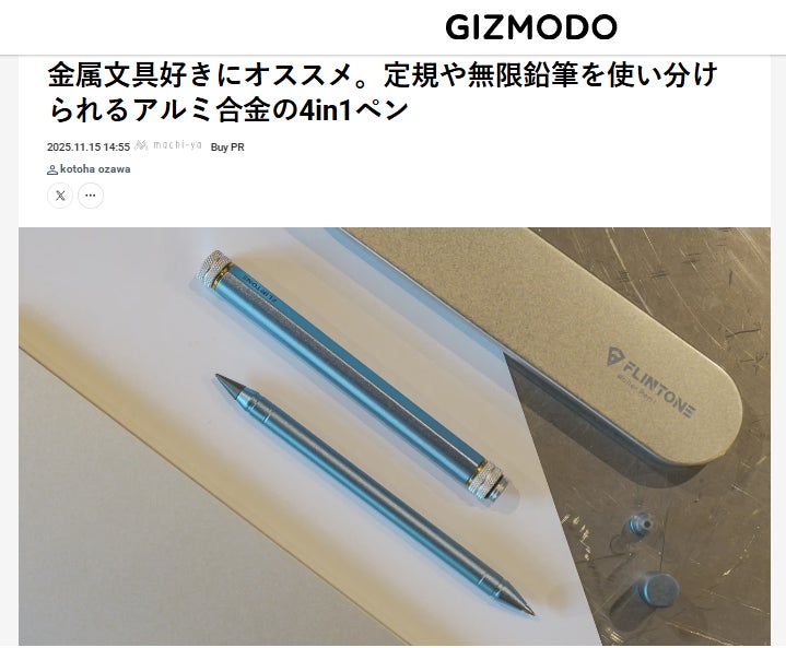 皆様、こんばんは!Brightチームです。11月15日、Gizmodoで「FLINTONE 4in1 ペン 第2弾」を紹介して頂きました。話題:金属文具好きにオススメ。定規や無限鉛筆を使い分けられるアルミ合金の4in1ペン興味がある方、是非下記のリンクからアクセスしてみてください。https://www.gizmodo.jp/2025/11/machi-ya-flintone-review-877824.html【レビューの一部抜粋】〈それぞれの使い心地を検証ボールペンの書き味はスムーズでスッと線が伸びます。細字でもムラが出にくく、長文でも手が疲れにくい印象でした。エターナルペンシルはほとんど減らないから削らなくてもいい鉛筆。素材はカーボン合金芯でHB相当の鉛筆に近い書き心地なので硬め。紙への出方もちょっと薄めですが、メンテナンスも不要な鉛筆としてスケッチなどに便利。定規はcmとインチの2パターンで使え、金属製なのでしっかりとした使い心地が好みでした。また両端がローラーになっているので平行移動もスムーズですよ。最後はスタイラス。あくまでシンプルなタッチペンのため、パームリジェクションや筆圧検知、傾き検知といった機能には非対応な点にはご注意を。Apple Pencil等があればあまり使わない機能かもしれませんが、指での操作よりもう少し精度アップしたい場合には役立つかと。〉ご興味のある方はこの機会をお見逃しなく!https://camp-fire.jp/projects/877824/view11月30日まで販売期間は続きますので、ぜひSNSでのシェアや身近な方にもおすすめしていただけると嬉しく思います。#brightdiyどうぞよろしくお願い致します。BRIGHTチーム