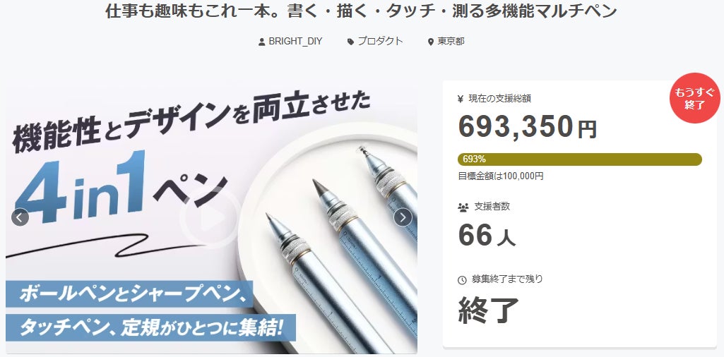ご支援者様、仕事も趣味もこれ一本。書く・描く・タッチ・測る多機能マルチペンにご興味をお持ちいただきありがとうございます。プロジェクト開始から51日目で66人ものご支援者の方々より支援頂き、無事プロジェクト終了を迎えることが出来ました。早速皆様のリターンを2026年02月末にお届けできるよう準備を始めております!皆様にご満足いただけるリターンをお届けできるよう、全力で取り組んで参りますので引き続き、「仕事も趣味もこれ一本。書く・描く・タッチ・測る多機能マルチペン」をよろしくお願い致します。BRIGHTチーム