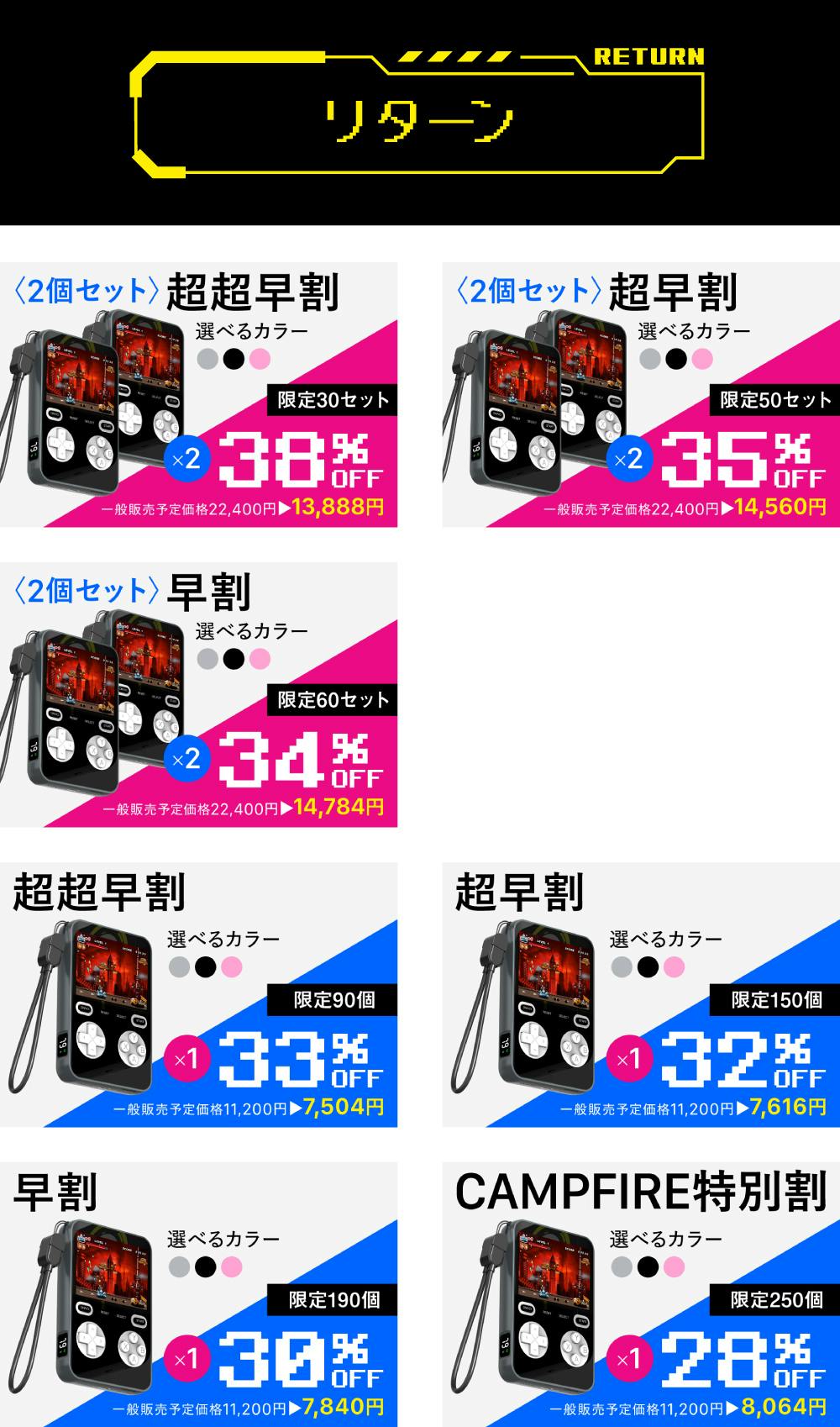 ※このプロジェクトで取り扱うリターン品はOEM/ODM生産です。※一部国内に類似商品が出回っている場合がございます。弊社では他社の類似品に関してのお問い合わせには対応できませんのでご了承ください。※並行輸入品が発生する可能性があります。正規以外での個人輸入等は、完全に防ぐことができない場合がございます旨、予めご了承のほどお願いいたします。並行輸入品は正規代理店による製品保証を受けることができません。また、正規代理店を通じて購入することで、日本国内での流通に必要な各種認証の取得や、関税の適切な処理が担保されます。 ※実際の使用感などは、個人差や使用環境の差が予想される製品でございます。そのため、使用感等に関する返品・返金はお受けいたしかねます。※初期不良以外に関する返品・返金はお受けいたしかねます。※モニター環境によって、画像の色が実物と異なって見える場合がございます。※想定を上回る皆様からの支援により、量産体制を更に充実させることができた場合、一般販売価格が予定価格を下回る可能性がございます。※ご支援の数が想定を上回った場合、製造工程上の都合等により出荷時期が遅れる場合がございます。※正規以外での個人輸入等は、完全に防ぐことができない場合がございます旨、予めご了承のほどお願いいたします。※本文中に記載させていただいたスケジュールは、あくまでプロジェクト公開時点の予定です。クラウドファンディングの性質上、配送遅延のおそれがございます。