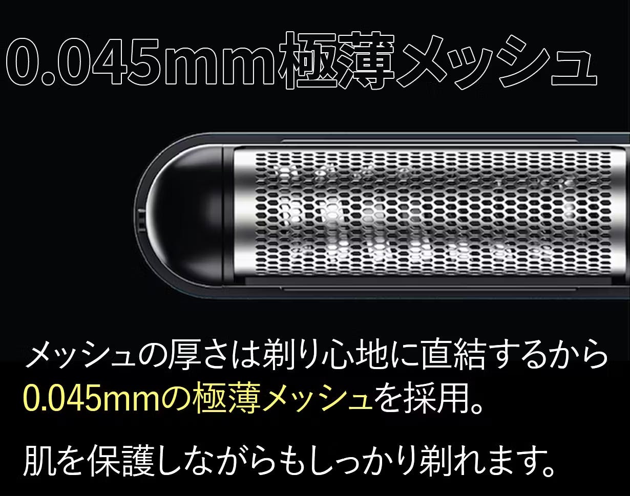 ZERA S SHAVERの最大の特徴の一つは、その極薄メッシュです。シェーバーのメッシュの厚さは、剃り心地に直結します。ZERA S SHAVERでは、なんと0.045mmの超薄型メッシュを採用しています。この薄型メッシュにより、非常に細かいヒゲまでしっかりキャッチでき、深剃りが実現します。それでいて、肌への負担が少なく、肌を保護しながらも効果的にヒゲを剃ることができるため、敏感肌の方でも安心して使用できます。