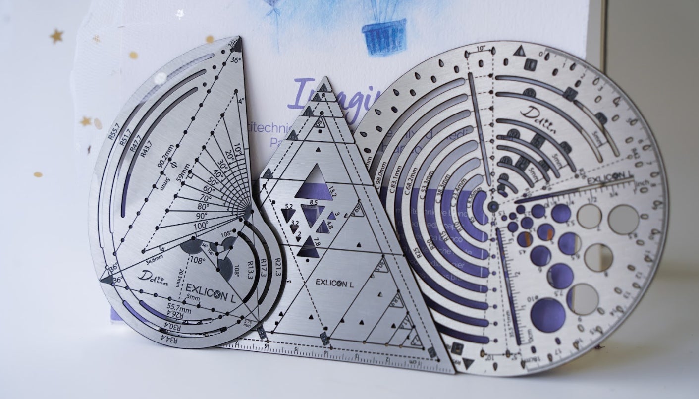 トライアングルツールには、黄金三角形を描くための穴が設計されています。このツールを使うことで、黄金三角形の美しい比率を簡単に再現できるため、アートやデザインのクオリティを一段と引き上げることができます。具体的には、7つの黄金三角形のマークグループがあり、それぞれが異なる比率を提供するので、複雑なデザインや図形を正確に描くことが可能です。