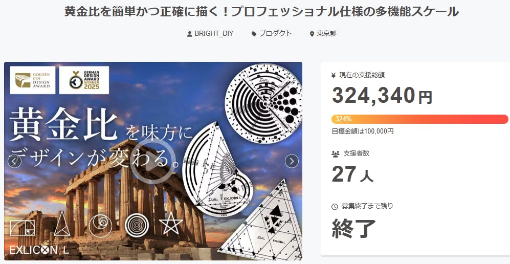 ご支援者様、黄金比を簡単かつ正確に描く!プロフェッショナル仕様の多機能スケールにご興味をお持ちいただきありがとうございます。プロジェクト開始から53日目で27人ものご支援者の方々より支援頂き、無事プロジェクト終了を迎えることが出来ました。早速皆様のリターンを2025年12月末にお届けできるよう準備を始めております!皆様にご満足いただけるリターンをお届けできるよう、全力で取り組んで参りますので引き続き、「黄金比を簡単かつ正確に描く!プロフェッショナル仕様の多機能スケール」をよろしくお願い致します。BRIGHTチーム