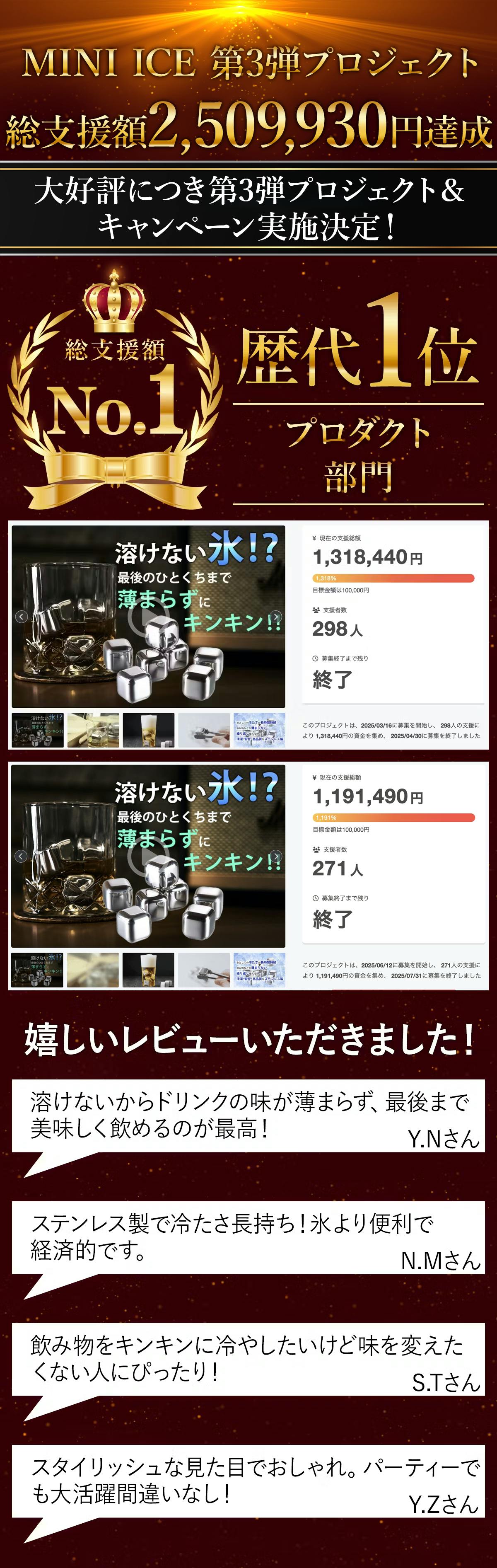 • ご支援者様、溶けない氷!?飲み物を薄めずに冷やす!ステンレス製アイスキューブMINI ICEにご興味をお持ちいただきありがとうございます。プロジェクト開始から50日目で24人ものご支援者の方々より支援頂き、無事プロジェクト終了を迎えることが出来ました。早速皆様のリターンを2026年02月末にお届けできるよう準備を始めております!皆様にご満足いただけるリターンをお届けできるよう、全力で取り組んで参りますので引き続き、「溶けない氷!?飲み物を薄めずに冷やす!ステンレス製アイスキューブMINI ICE」をよろしくお願い致します。BRIGHTチーム もっと見る