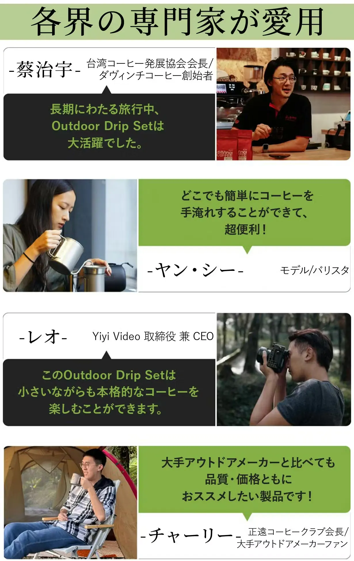 そこで出会ったのがこのOutdoor Drip Setでした。どこに行くときも場所を取らず、全てが一つのケースに入っているので、忘れ物もしない。コーヒーに力を入れている商品ですが、お茶も美味しく飲めて、期待以上の結果を出してくれる商品です。