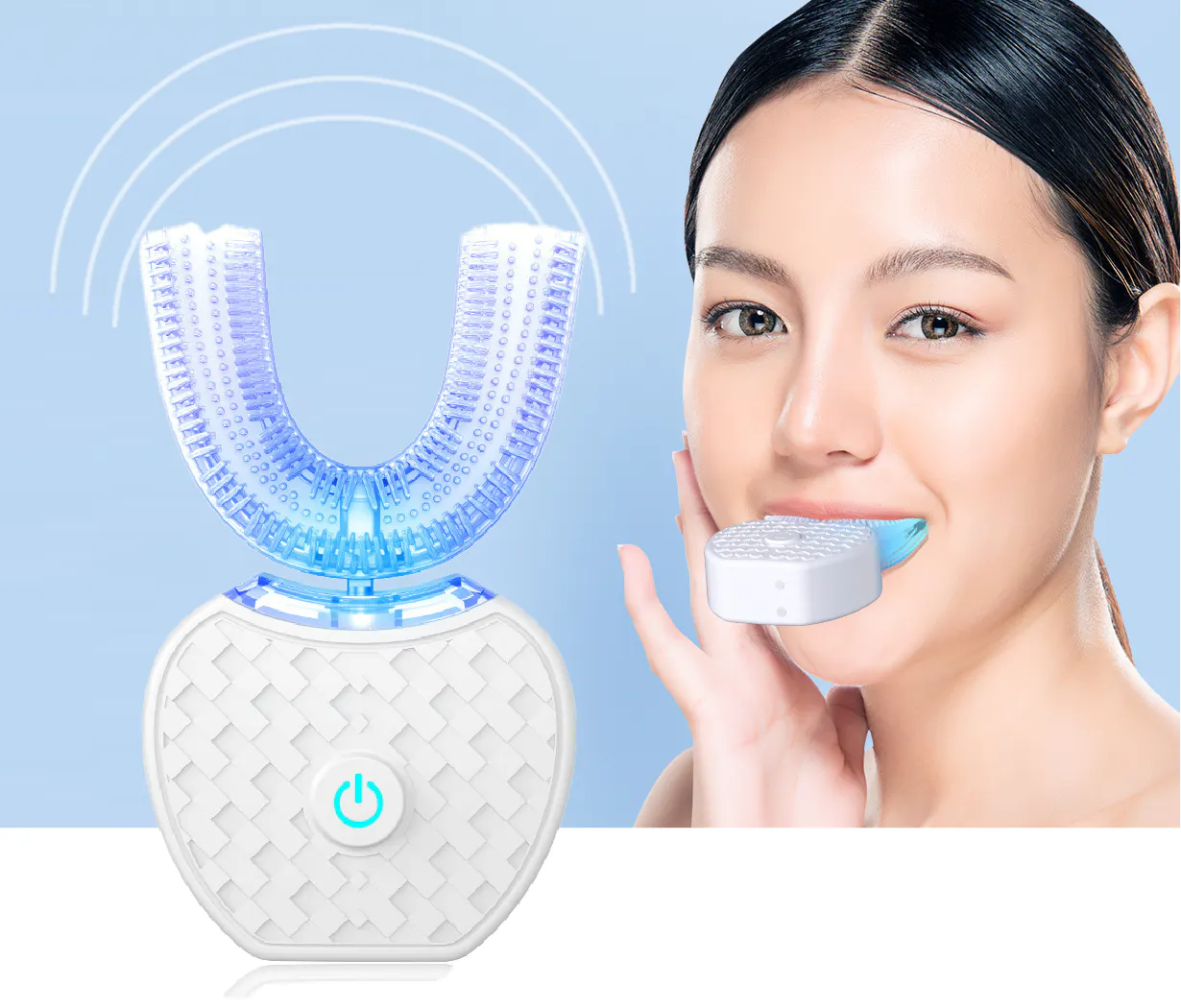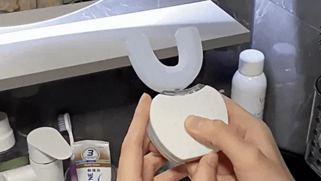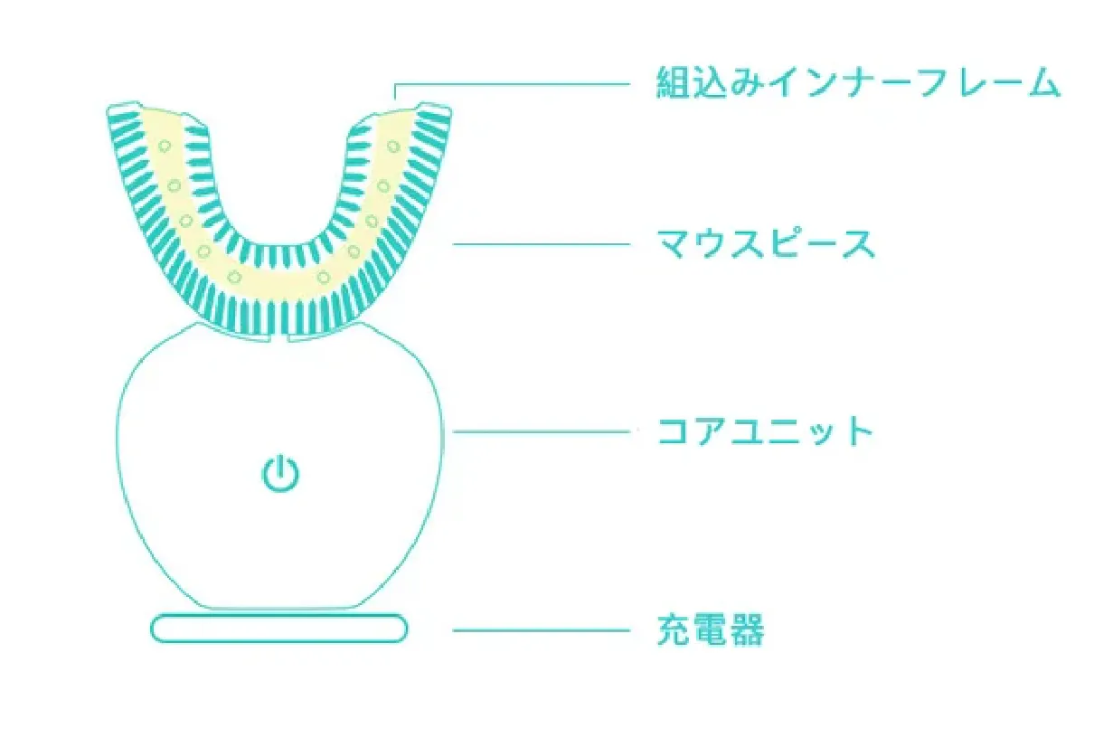 U字型ブラシが歯列全体を包み込み、超音波振動が歯垢や着色汚れを浮かせます。