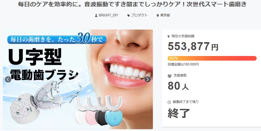 • ご支援者様、毎日のケアを効率的に。音波振動ですき間までしっかりケア!次世代スマート歯磨きにご興味をお持ちいただきありがとうございます。プロジェクト開始から42日目で80人ものご支援者の方々より支援頂き、無事プロジェクト終了を迎えることが出来ました。早速皆様のリターンを2026年02月末にお届けできるよう準備を始めております!皆様にご満足いただけるリターンをお届けできるよう、全力で取り組んで参りますので引き続き、「毎日のケアを効率的に。音波振動ですき間までしっかりケア!次世代スマート歯磨き」をよろしくお願い致します。BRIGHTチーム もっと見る