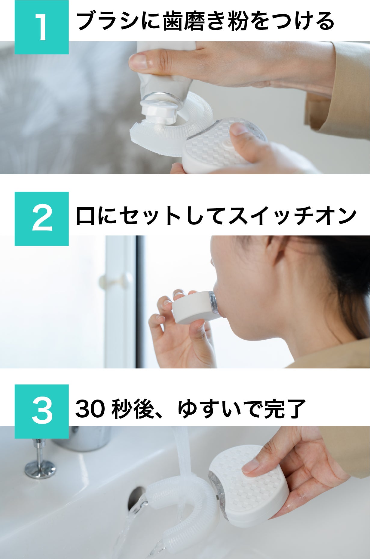 歯磨き粉をのせて、口にくわえてスイッチを押すだけ。