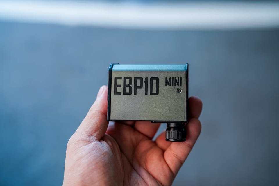 今回試したのは小型電動空気入れ「EBP10 シリーズ」から、より小さいタイプで携帯しやすい「EBP10 MINI」。片手に収まるサイズ感で、ボディはアルミ製のしっかりした作り。