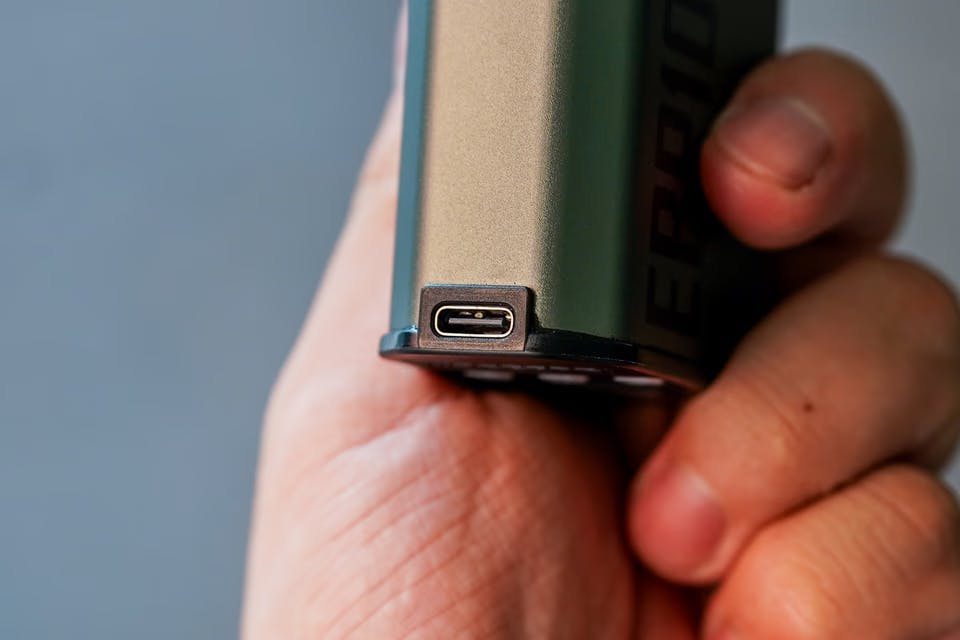 充電端子はUSB Type-C。スマホのアダプタなどでサッと対応可能。空気を入れられるタイヤの本数はサイズにもよって異なりますが、参考としてはロードバイクにも多い700×25Cを80PSI(5.5bar)で2本満充電が可能です。〉