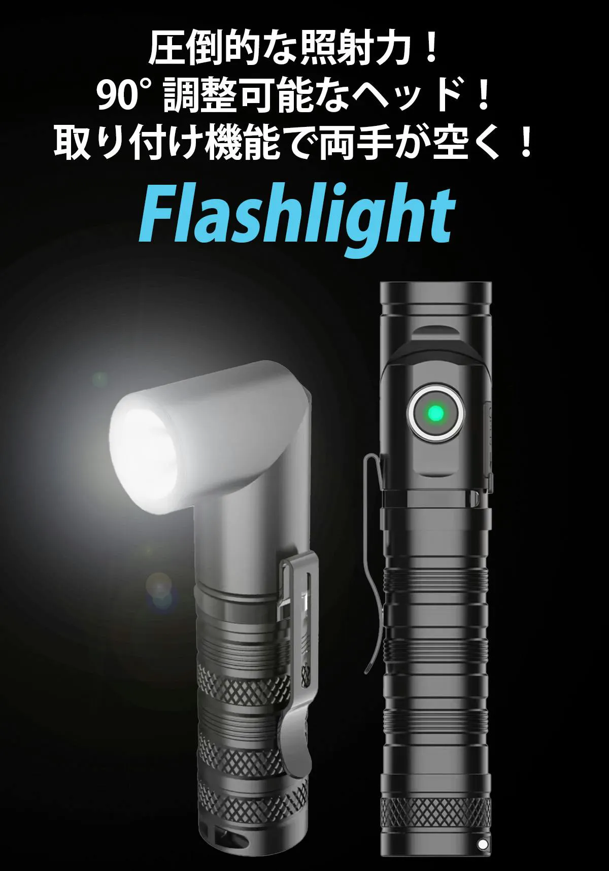 片手に収まるコンパクトサイズなのにパワフルな照射距離と明るさ!クリップ・磁石付きでヘッドも90度に曲げられるので帽子やポケット装着、金属板への固定できて手がふさがりません。