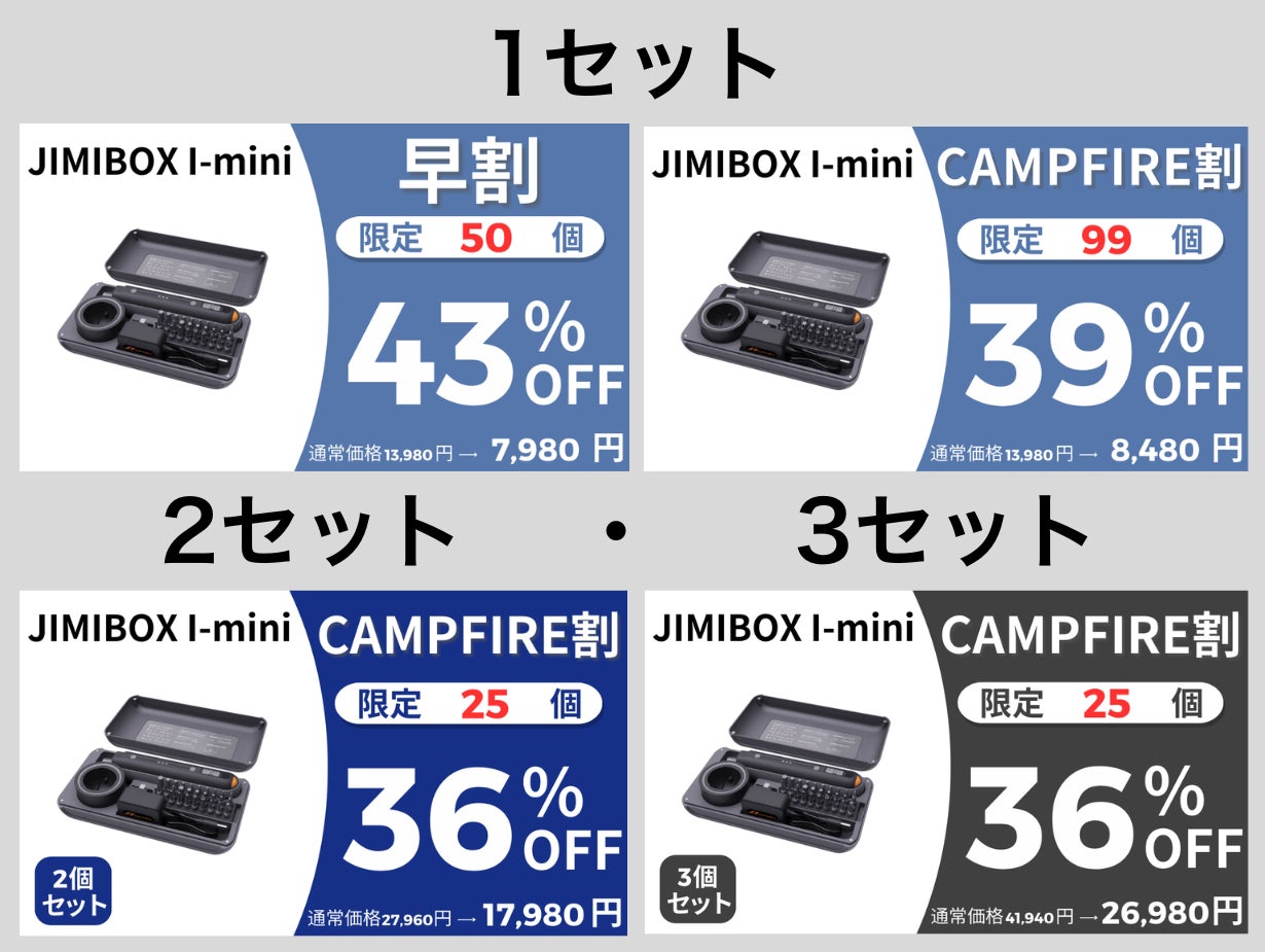 JIMIBOX I-miniはたくさん支援いただいたJIMIBOX X1-Iからツールを厳選して持ち運びやすくコンパクトにまとめた多機能セット。トルク調整機能やロック機能などの便利機能が詰まった多機能電動ドライバーと、立てたまま充電できる充電台、様々なビットと便利ツールを全てまとめてコンパクトに保管、持ち運びできるセットで、皆様にもっと自由にDIYを楽んでほしいという思いでプロジェクトを起案させていただきました。