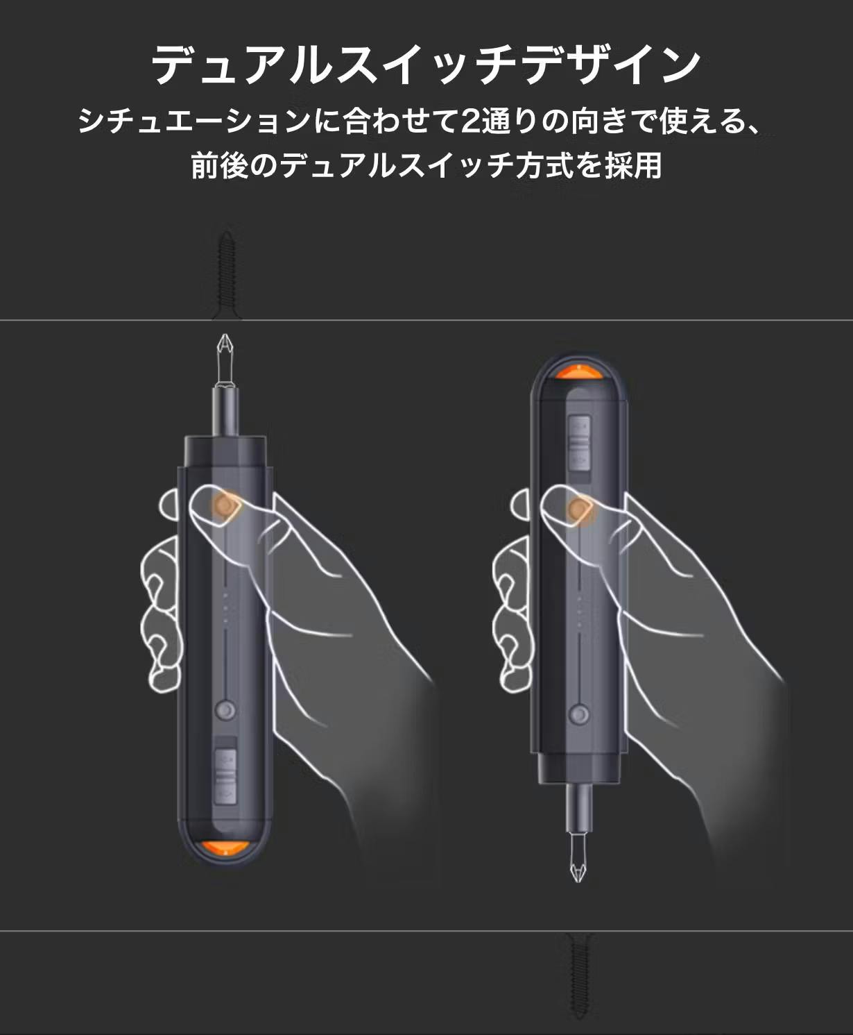 一般的なドライバーでは、回転方向を変えるたびに持ち替えたり、角度を工夫したりする必要がありますが、JIMIBOX I-miniは前後にスイッチが配置された「デュアルスイッチ方式」を採用。これにより、作業中に持ち手を変えることなく、どちらの方向からでも快適に操作ができるため、狭い場所や手の届きにくい場所でもスムーズに対応できます。