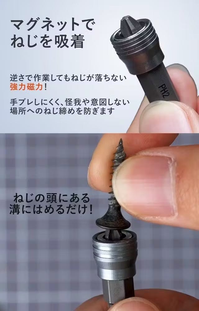 マグネット付きビットがねじをしっかり吸着し、作業中にねじが落ちる心配を大幅に軽減します。特に逆さ向きでの作業や、手元が不安定な場面でも、強力な磁力でねじをしっかり固定。手ブレによるズレや、意図しない場所への締め付けを防ぎ、正確でスムーズな作業をサポートします。使い方も簡単で、ねじの頭にある溝にはめ込むだけ。誰でも安心して使える便利な機能です。