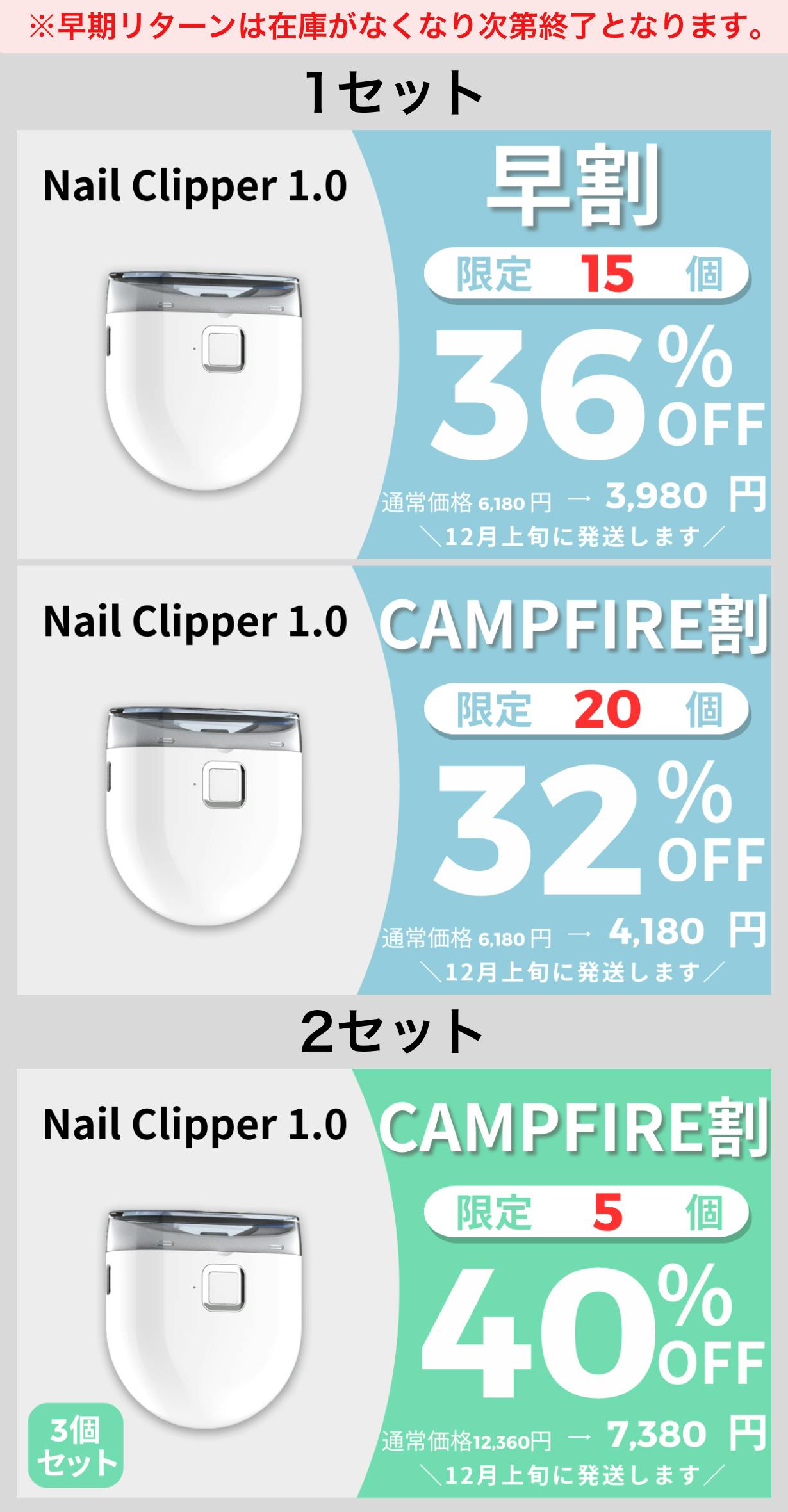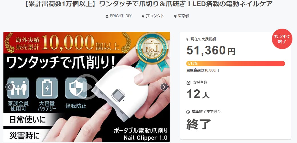 2025/12/01 00:10ご支援者様、【累計出荷数1万個以上】ワンタッチで爪切り&爪研ぎ!LED搭載の電動ネイルケアにご興味をお持ちいただきありがとうございます。プロジェクト開始から38日目で12人ものご支援者の方々より支援頂き、無事プロジェクト終了を迎えることが出来ました。早速皆様のリターンを2025年12月末にお届けできるよう準備を始めております!皆様にご満足いただけるリターンをお届けできるよう、全力で取り組んで参りますので引き続き、「【累計出荷数1万個以上】ワンタッチで爪切り&爪研ぎ!LED搭載の電動ネイルケア」をよろしくお願い致します。BRIGHTチーム もっと見る
