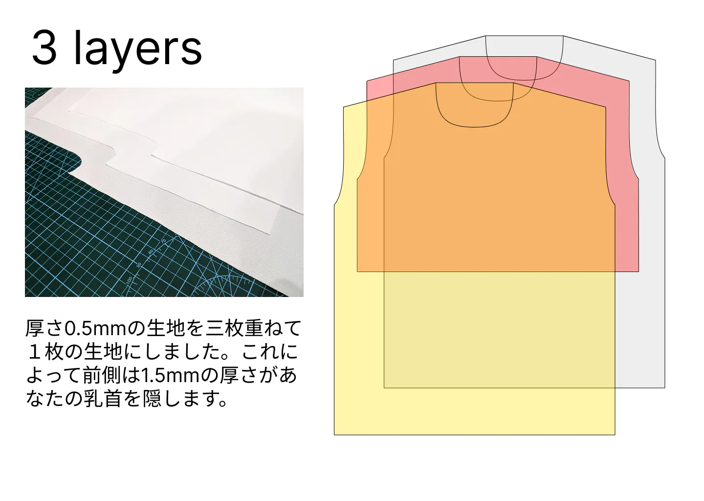 一枚0.5mm の肉厚の生地を3枚使うことで、乳首の透けやブラジャーの透けを平均的な服よりも回避します。