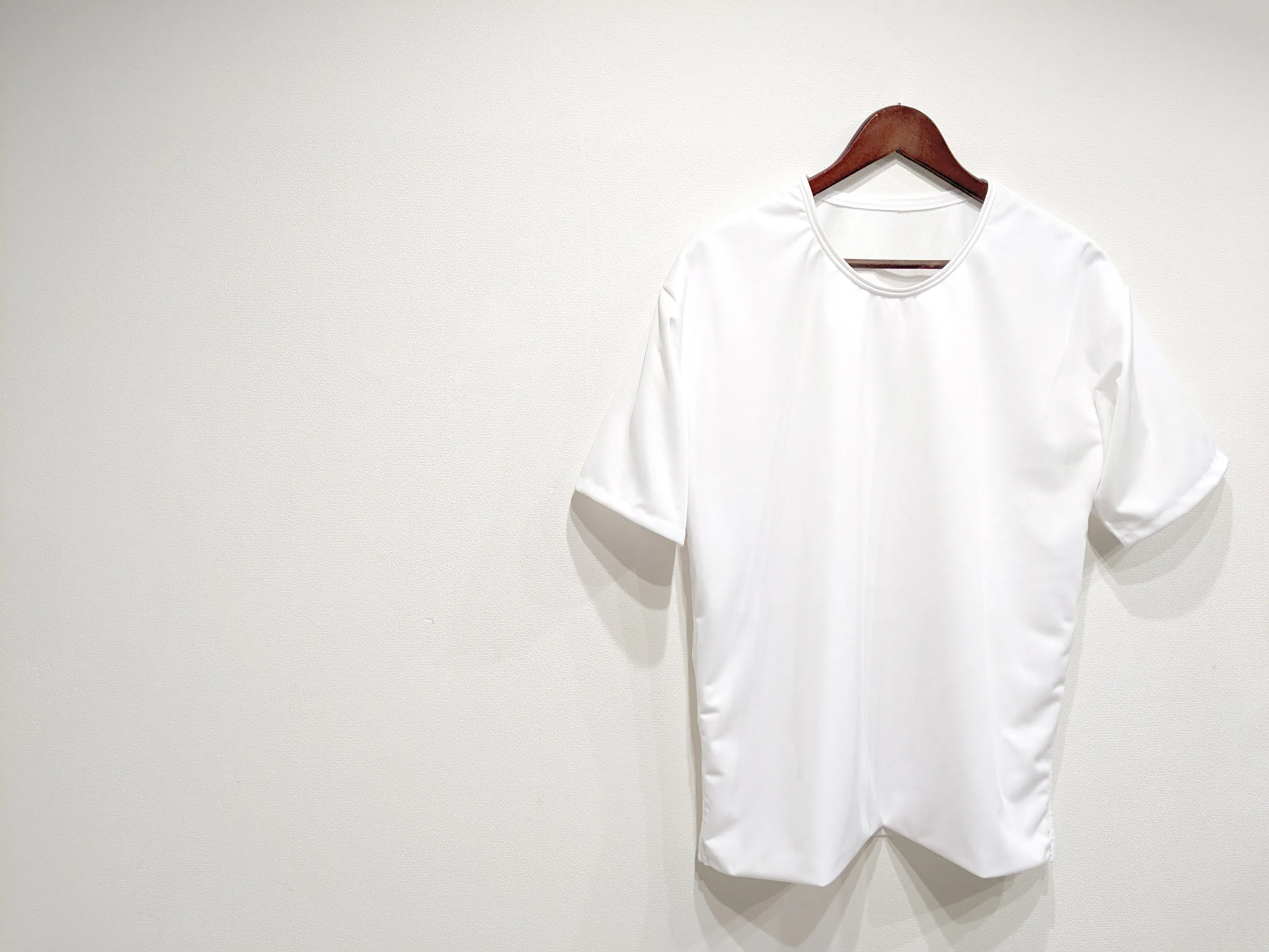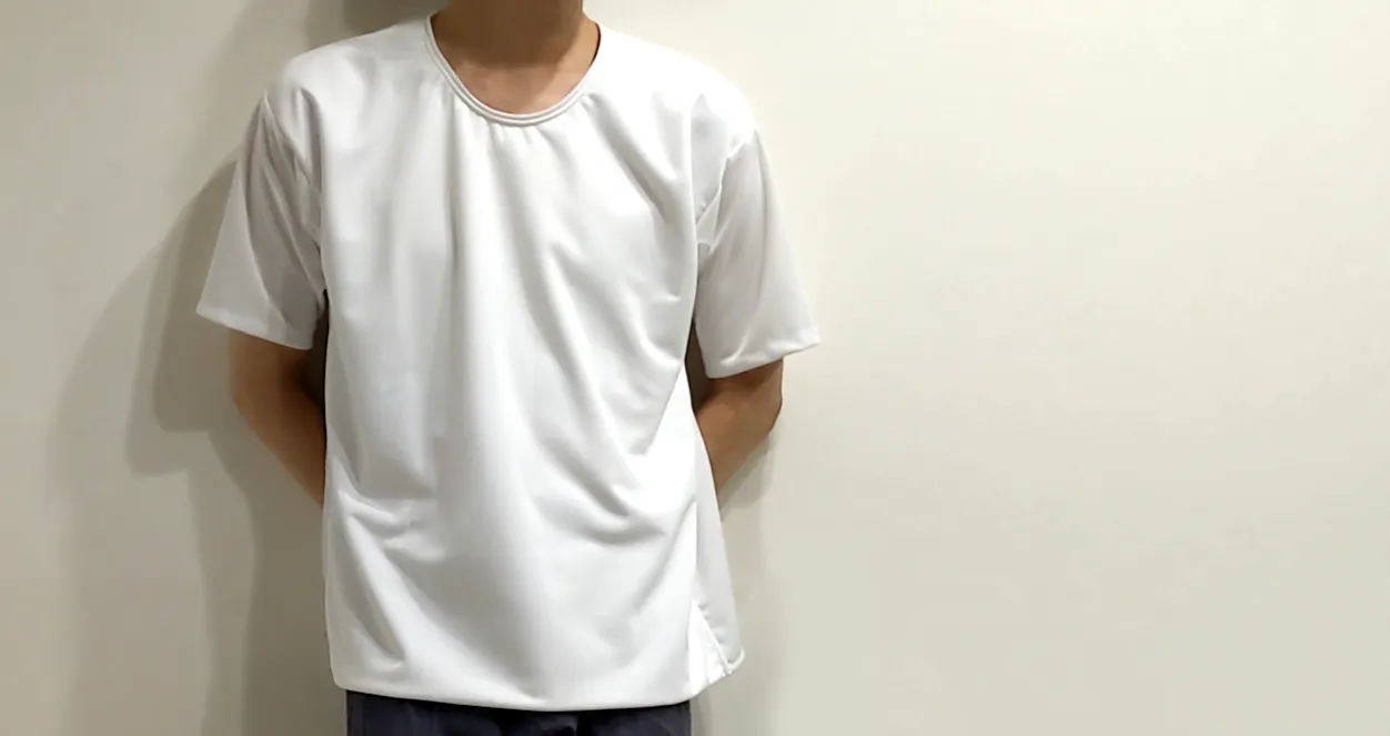 ただし、我々が今回開発したTシャツは、乳首ゾーンの部分の厚さが1.5mmある極肉厚、前に3枚の生地を重ねて作った超極厚の生地を使うことによって、ちくぽこを最大限抑制します。胸を思いっきり張ることをしなければまずチクぽこしません。