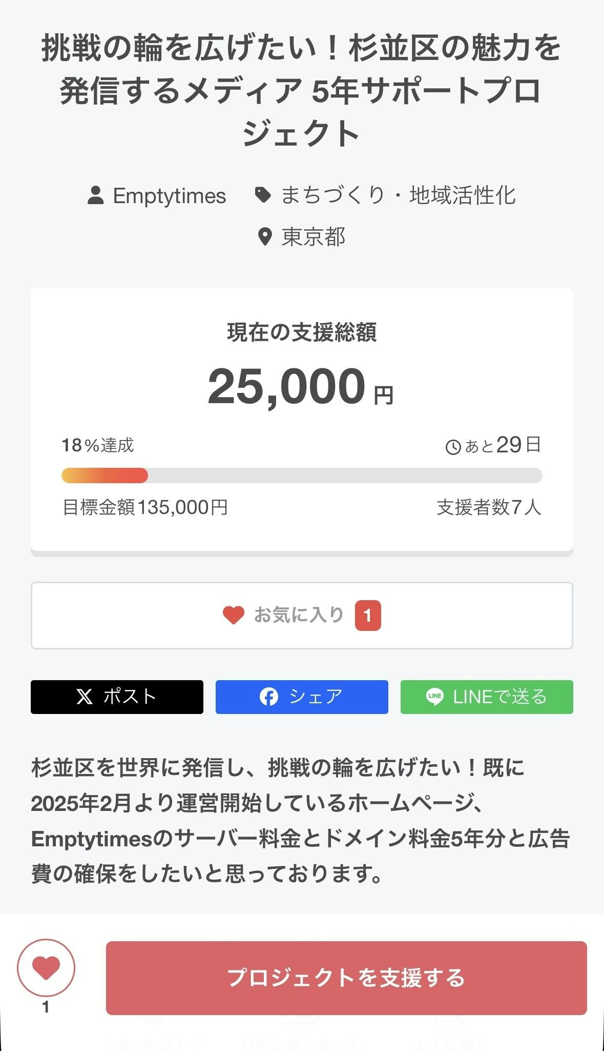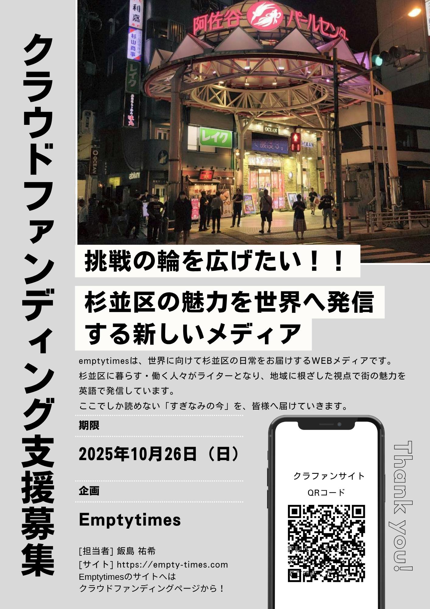 2025/09/28 10:09クラウドファンディング立ち上げから1週間。最初は支援が得られず焦りもあり、友人からダメ出しされて凹んでいました。でも支援者が1人、2人と増えていくと素直に嬉しい。もっと増やしたいというやる気が出てきました!!役所へ周知のお願い、友人への声がけを終え、これからはEmptytimesの Instagramの方でもフォロワーを増やしていき、観光事業との連携の話を進め、更には杉並区のお店を50軒(できれば100軒)回ってチラシ配りもしようと考えています!!!ここまできたらもう我武者羅。やれることはやりきって必ず支援額の目標を達成したいので、是非ご支援のほどよろしくお願いいたします!! もっと見る