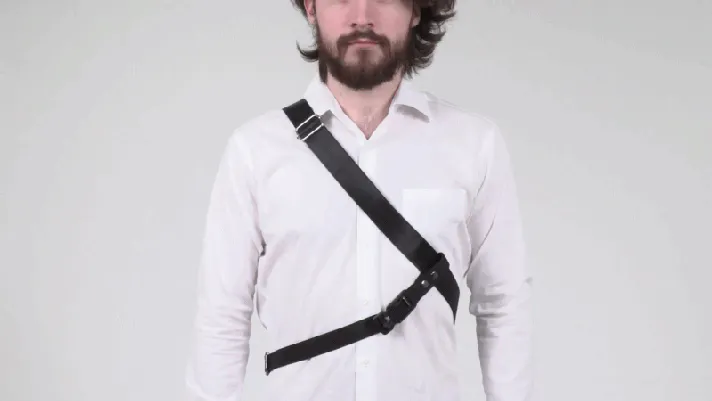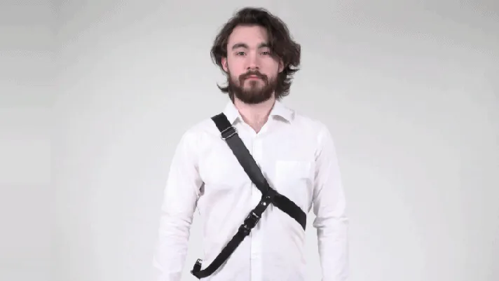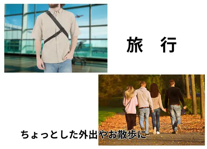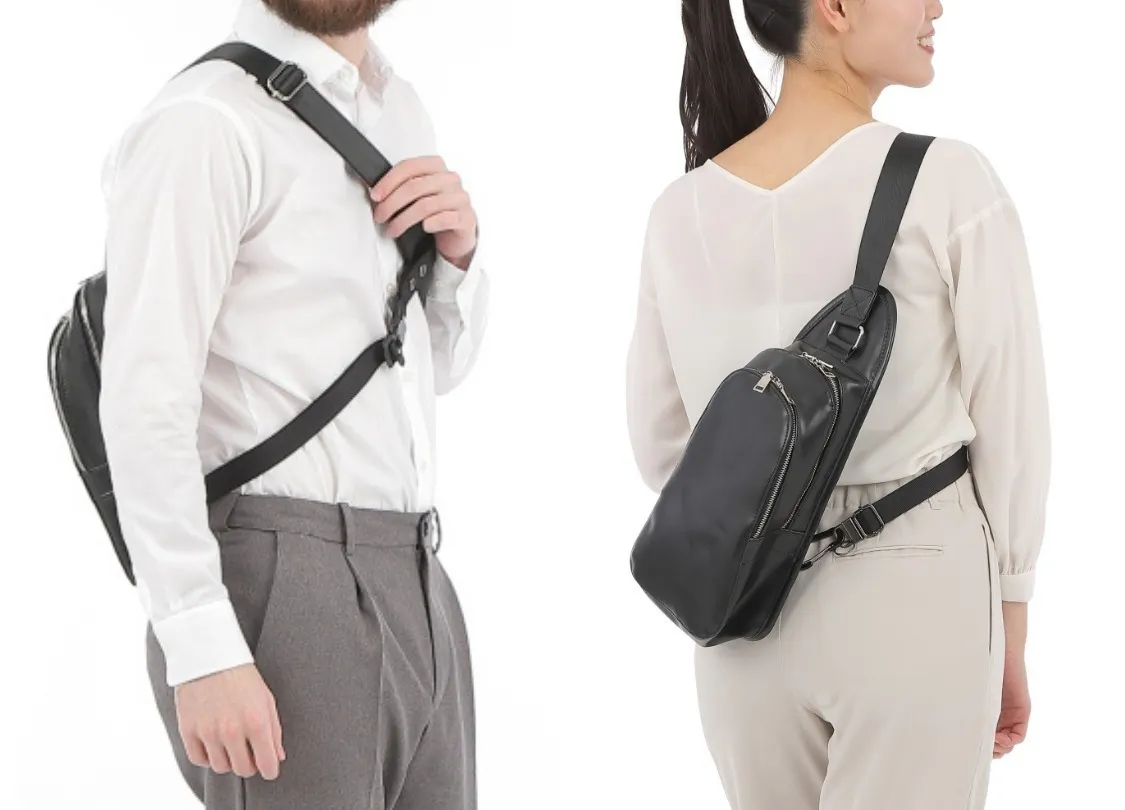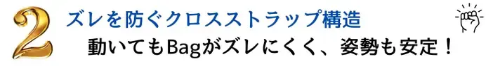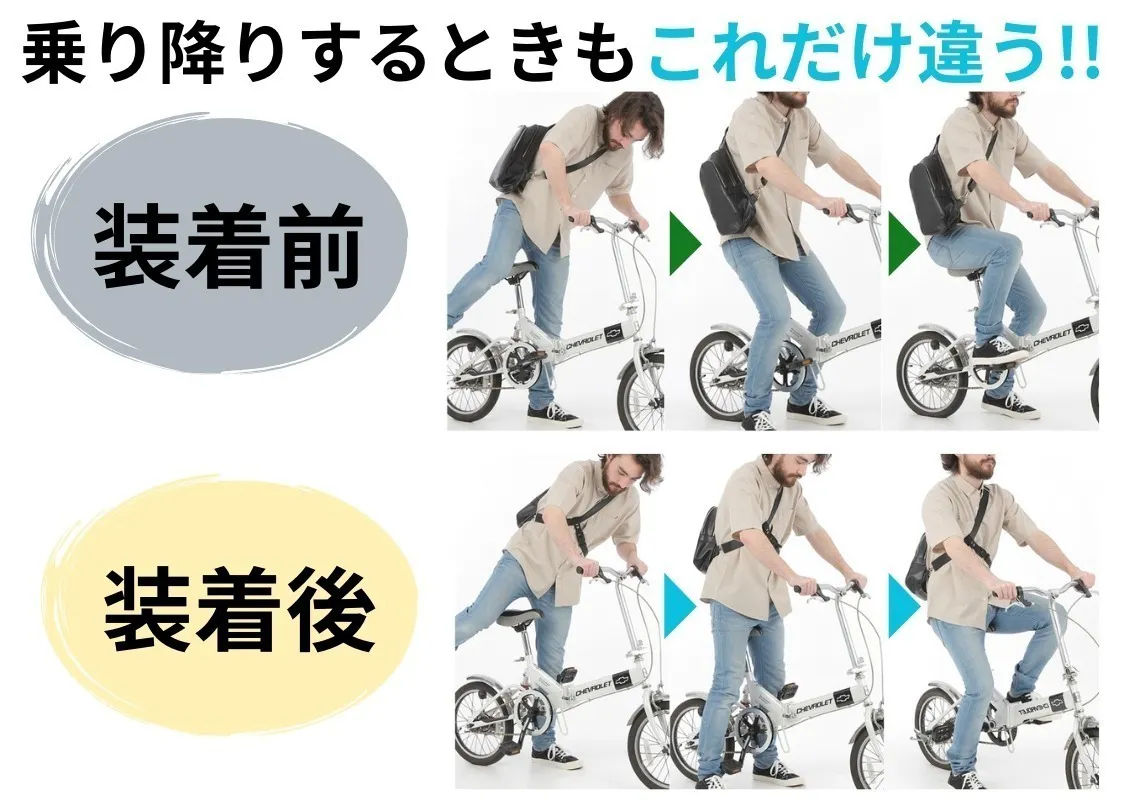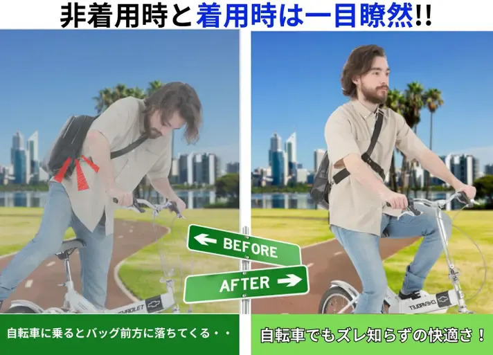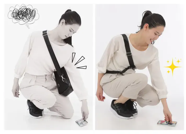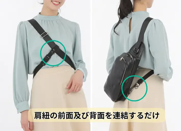 体の反対側にクロスして固定することで、バッグの揺れやズレを防ぎます。