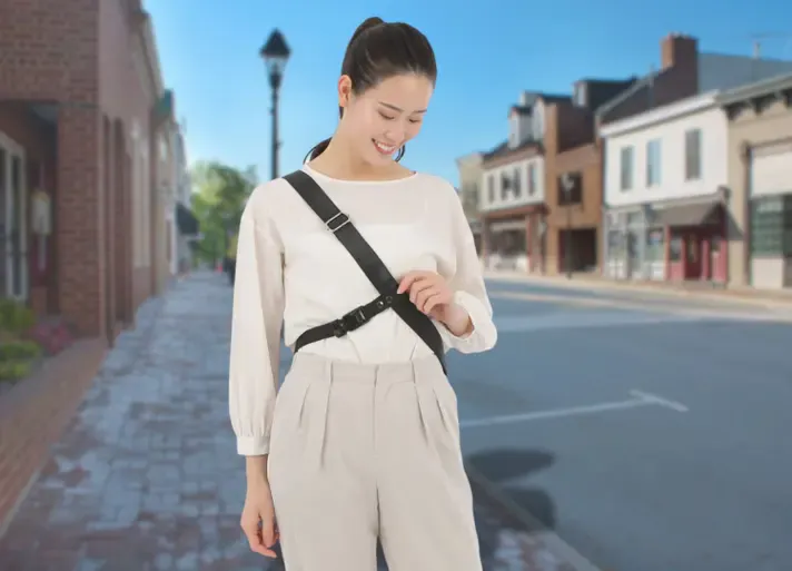 体にしっかりフィットしてバッグを固定。歩いても動いてもズレにくく、自然な姿勢を保てます。