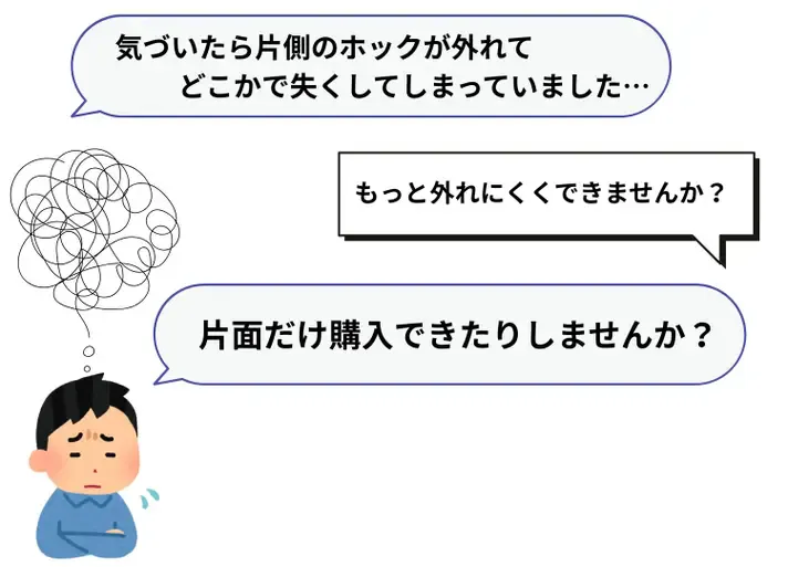 外れにくさを求めて、ボタンホックからジャンパーホックへ変更。しかし見た目に納得できず…。商社に相談し、両面頭ジャンパーホックをオーダー。試行錯誤の末、ようやく理想のパーツにたどり着きました。