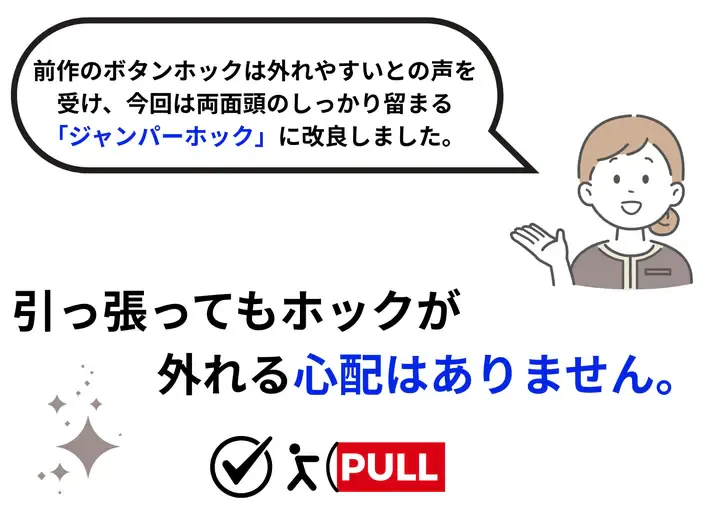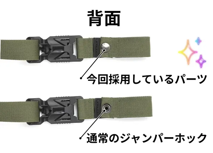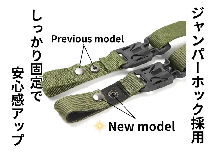 従来のボタンホックをジャンパーホック(両面頭)に変更し、より外れにくく、スタイリッシュな仕上がりに。