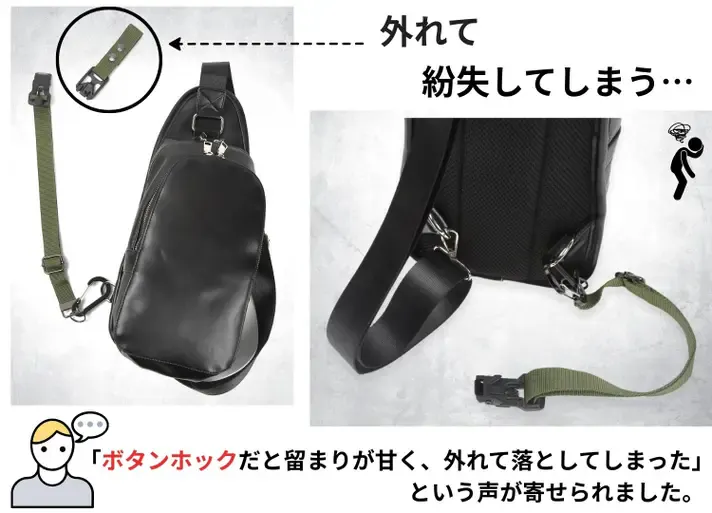 ショルダーバッグやボディバックは両手が使えて荷物へのアクセスが容易なため重宝するけれど・・・片方の側に偏るため、動作中にバランスが崩れる。。。