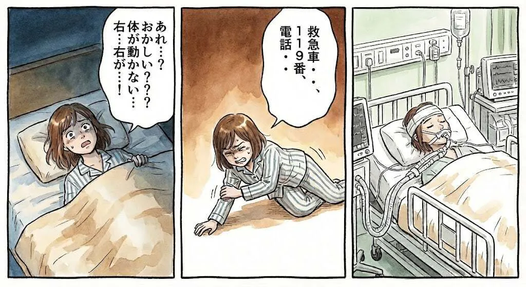 私の友人の画家Cさんは29歳の時、一人暮らしの部屋で寝ているときに脳梗塞が起こりました。違和感を感じて目覚めたときには右半身が動かない状態でしたが、何とか自力で救急車を呼び、病院に搬送されました。