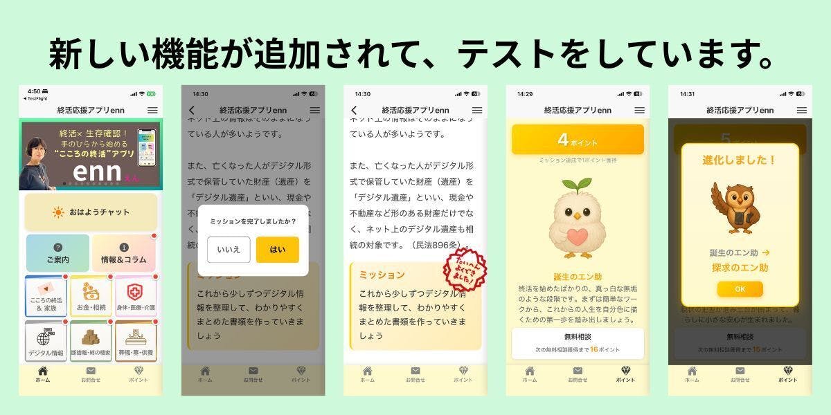 この度は多くの方よりご支援をいただき、ありがとうございました。先週、公式キャラクター「エン助」のサンクスカードを、ライフビジョン研究室よりメールやLINE等で送らせていただきました。もし「まだ届いていないぞ!」という方がいらっしゃいましたら、大変恐れ入りますが迷惑メールになっているかもしれませんので、チェックをお願いいたします。アプリの方は順調に開発が進んでおり、テストを開始しました。1)生存確認のための「おはようチャット」が目立つようになりました。2)終活ワークのミッションをクリアしたら、ポイントをもらえます。3)そのポイントをためると、「エン助」が成長・進化していきます。これから少しずつ修正→テスト、修正→テストを繰り返しながら、完成させていきます。このアプリは、終活を気軽に楽しくやっていただくために作りました。できるだけ早く皆様のお手元に届けられるように頑張ってまいります。