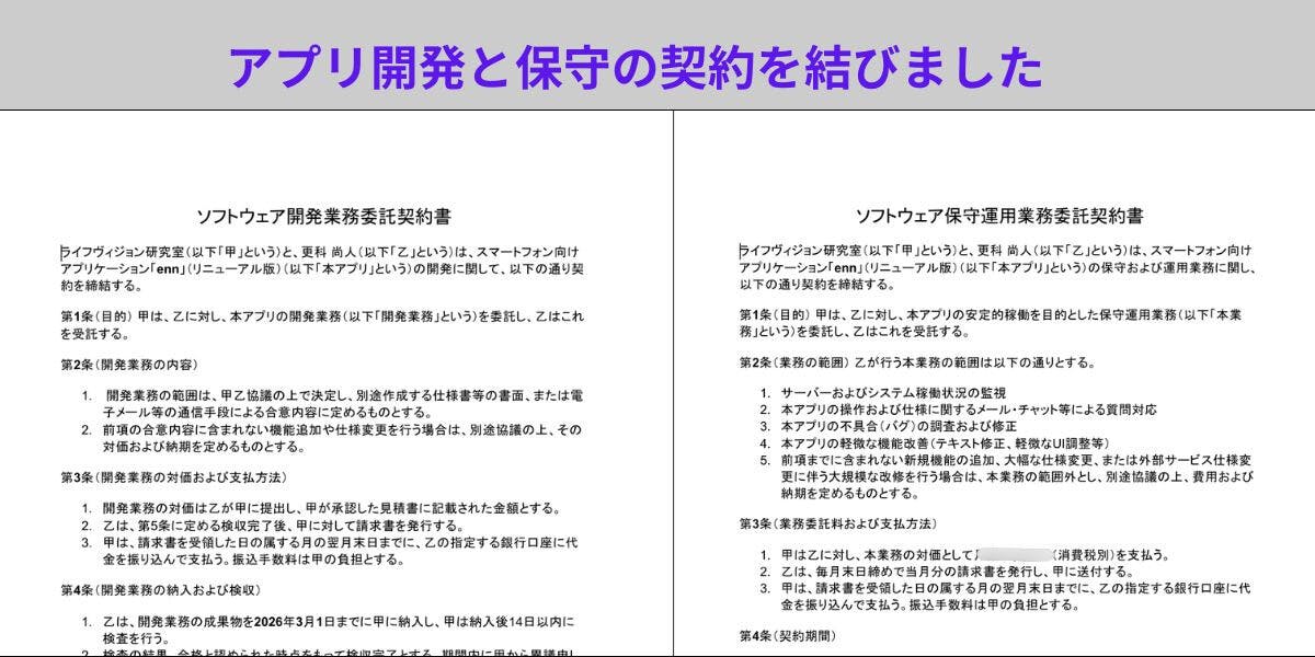 また、独自のアイデアで複数の特許を取得されており、知識も経験も豊かで信頼できる方です。年末から話し合いを重ね、現アプリにはないいくつかの機能も加えていただけることとなり、2026年1月8日に契約書を交わしました。契約では、3月1日までに納入していただくことになっています。