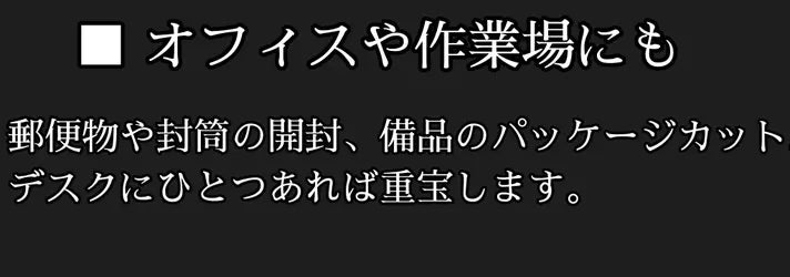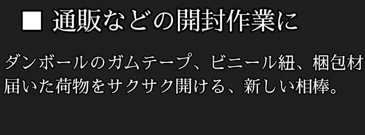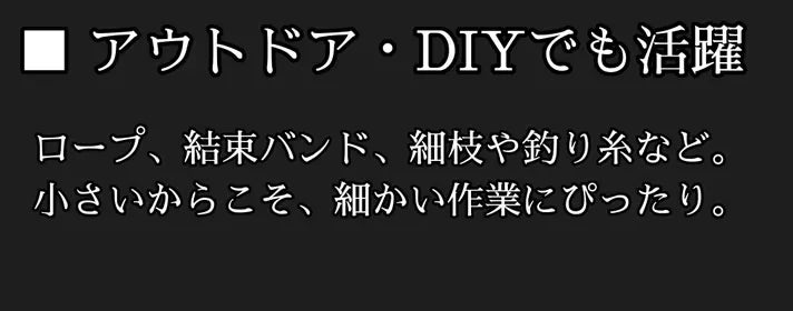 A. 荷物の開封はもちろん、アウトドア・釣り・DIY・クラフトなど幅広いシーンで活 躍します。特にロープや細枝のカット、簡単な木の削りにも便利です。
