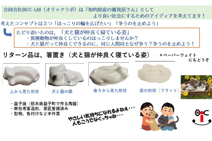 日々の創出活動の中で、オリジナルである事、意匠登録する事を考え、陶器の箸置き(犬と猫)を発想し、商品化したのでこれを販売したい。コンセプトは2つ、1つは、犬と猫が仲良く寝ている姿を見るとホッコリする感情、そのホッコリの輪を広げたい、もう1つは犬と猫同志でも仲良くなれるのに、「人間同士争いを止めよう」というメッセージ。
