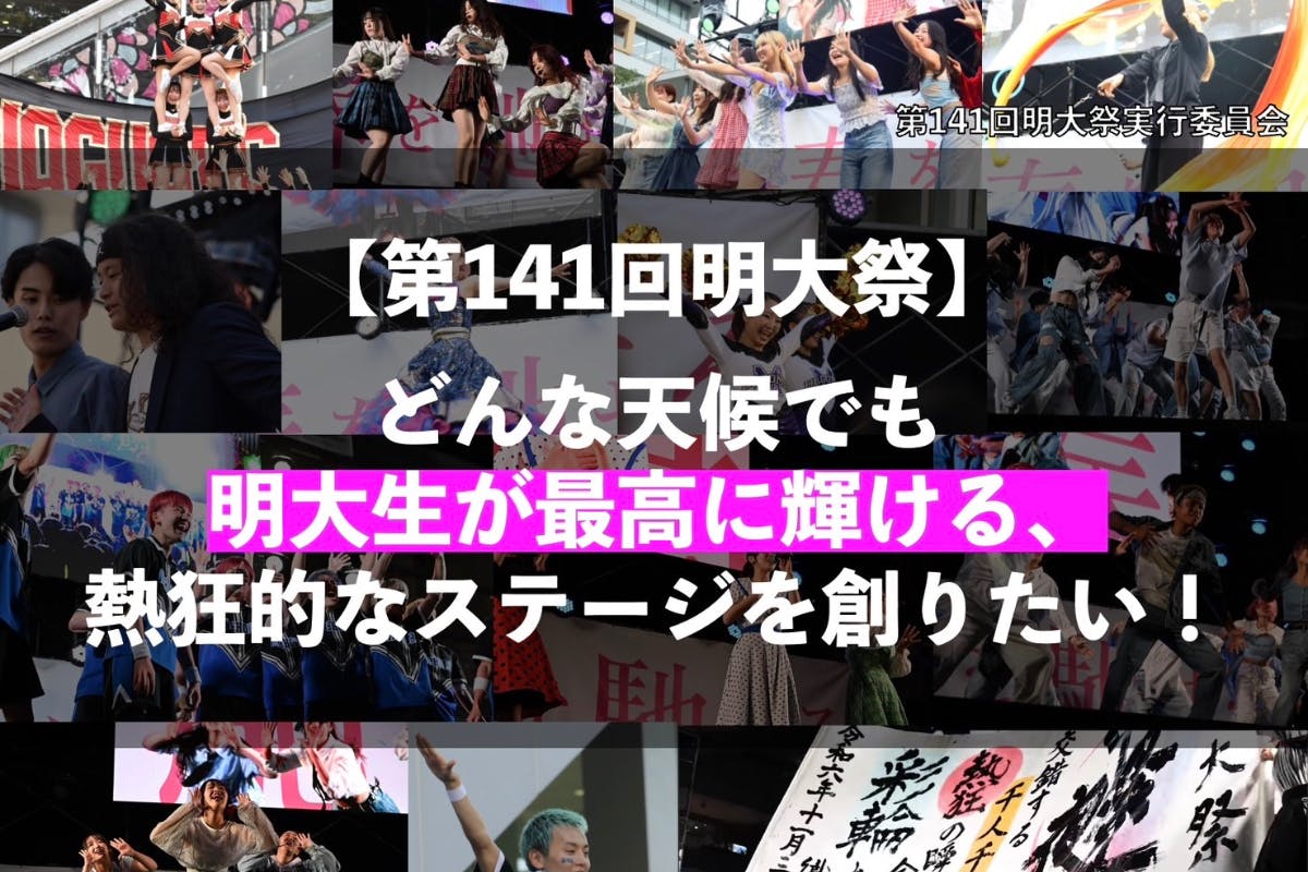 昨年の明大祭では、雨天により一部ステージが中止となり、参加団体、実行委員会にとって悔しい結果となってしまいました。今年は悔しい思いをしないように、パワーアップしたステージで、パワーアップした参加団体の演目を実現すべく皆さまにご支援いただきたいと考えております。