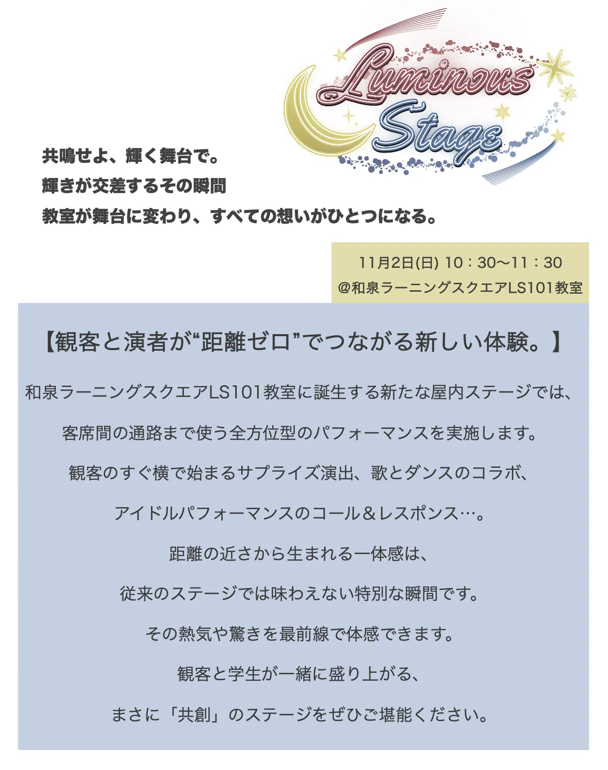 2025/11/03 01:04こんばんは!明大祭実行員会です。11月2日、明大祭2日目が無事に終了いたしました。ご来場いただいたみなさま、ご支援していただいたみなさま本当にありがとうございます!現在、クラウドファンディングでは目標金額の95%の支援をいただいております。みなさまの想いやコメントが私たちの日々の原動力になっています。さて、今回は、明大祭2日目に披露された、「Luminous Stage」の様子をご紹介します!Luminous Stageとは?「Luminous Stage」は、和泉ラーニングスクエアLS101教室に新設された「屋内ステージ」で行われる企画です。教室の特徴を活かし、客席間の通路も使った全方位型の新しいパフォーマンスを披露します。従来の屋外ステージよりも、より観客と演者の距離が近くなったことで「ゼロ距離」で一体感を味わえる特別なステージになっています。実際の様子ステージが始まると出演者が教室後方の扉から、客席の間を通って登場してきました!さっそくのサプライズ演出に会場内のワクワクが高まります。その後は、フラッシュモブ、ミュージカル、ジャグリング、ダンスのパフォーマンスが続きました。このように客席中央の通路もステージとして使用することで、観客と出演者の距離がグッと縮まり、臨場感あふれるステージになりました!観客もただ観るだけではなく、配布されたサイリウムを振ったり手拍子をしたり、会場一体となって盛り上がりました!最後は各出演団体によるカーテンコールによって幕を閉じました。他にも、、午後には、メインステージにて音楽フェスをテーマにした「UNI ROCK FES」が開催されました。バンドやDJのパフォーマンスにチアダンスも加わり、誰もが親しみやすく楽しめるステージとなりました!「UNI ROCK FES」の観客にはオリジナルのリストバンドが配られ、フェスさながらの雰囲気を感じられました!夜には「中夜祭」も行われました。圧巻の書道パフォーマンスから始まり、「男子チアリーディング×アイドルコピーダンスサークル」といった異色のコラボパフォーマンスなど、観るものを飽きさせない最高のステージにこの日一番の歓声が上がりました!最後に本日、11月3日(月・祝)が第141回明大祭の最終日となります。3日目も、たくさんの団体によるパフォーマンスがあります!!どれも注目ですが、特に最終日のトリを飾る「Ending」は、毎年多くの人が集まっており、目が離せない企画となっています!ぜひ、お待ちしております! もっと見る