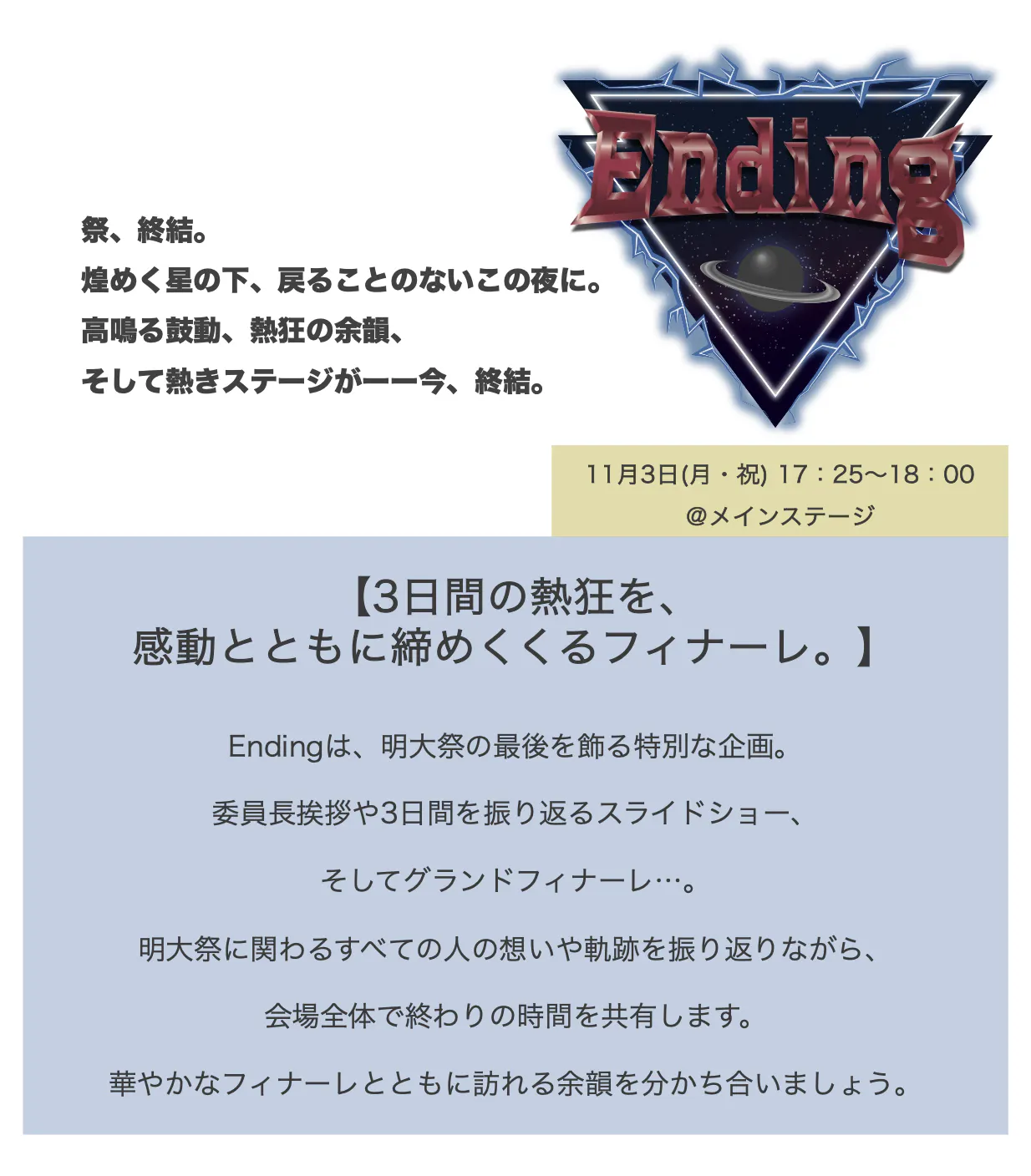 2025/11/04 00:21こんばんは。明大祭実行委員会です!本日11月3日(月・祝)18時をもちまして、明大祭は無事閉幕いたしました!1週間前は悪天候が心配された明大祭でしたが、天候にも恵まれ、最高のフィナーレを迎えることができました。クラウドファンディングは現在、目標金額の98%を超える988,000円のご支援をいただいております。ご支援、ご来場、温かい応援メッセージを通して、私たちの明大祭を盛り上げてくださったすべての方々、本当にありがとうございます。重ねてにはなりますが、みなさまからの支援や応援が私たちの活動の原動力となっています。さて、本日の活動報告では大盛況に終わった明大祭最終日の様子をお届けいたします!明大祭最終日の様子ここまでの活動報告ではステージ企画のみを取り上げてまいりましたが、せっかくの機会なのでステージ企画以外の明大祭の様子も少しだけご紹介します!和泉キャンパスの中庭にはたくさんの模擬店が立ち並び、連日大盛況でした。教室では多種多様な個性あふれる企画を実施していました。明大祭のフィナーレ「Ending」3日間の明大祭の集大成を飾るのは「Ending」すべての人の想いが交わる”熱い”ステージです。「Ending」が始まる前から、続々と人が集まるメインステージ。企画が始まる前から、会場中の期待が高まっていく空気を感じ取れました。トップバッターは「男子チアリーディングチーム ANCHORS」男子チアリーディングならではの勢いと迫力のあるパフォーマンスで、会場が一気に盛り上がりました。それに続いて、アカペラサークルamour、K-POPカバーダンスサークルMercie、中野ダンスサークルre:SIGNがバラエティ豊かなステージを展開。それぞれの団体から熱い想いが感じられました!ここで団体のパフォーマンスは終了かと思いきや、数々の大会で実績を残している実力派ストリートダンスサークルMDDが登場!一糸乱れぬダンスを披露し、会場を沸かせました。会場も十分に盛り上がったところで、委員長・鞠子輝からの挨拶。想いが溢れて涙で言葉に詰まる委員長の姿に、観客からは今日一番の温かい声援が向けられました。その後はEnding恒例の「当日編集スライドショー」が放映されました。好きなことに一生懸命な、そんな姿が輝く、まさに青春を感じられるスライドショーでした。最後は、Meidaisai Championshipの表彰とグランドフィナーレ!ここまで出演してきた団体が再度登場し、Endingを締めくくりました。熱い想いが交わる、明大祭の最後にふさわしい素晴らしいステージでした!最後にここまで応援・ご支援ありがとうございます。多くの方々のご協力の上で明大祭は成り立っています。第141回明大祭は本日で閉幕いたしましたが、これからも明大祭の歴史は続いていきます。引き続き、温かく見守っていただけますと幸いです。そして、クラウドファンディングは目標まであと2%!最後まで気を引き締めて頑張りますので、応援のほどよろしくお願いいたします。 もっと見る