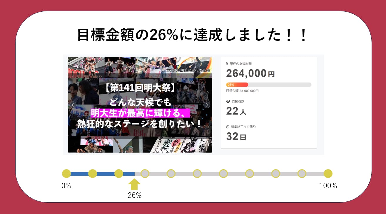 本日から、達成のお知らせとともに活動報告をお届けしていこうと思います。明大祭に向けて、実行委員会がどのような準備を進めているのか、少しでも感じ取っていただけたら嬉しいです!