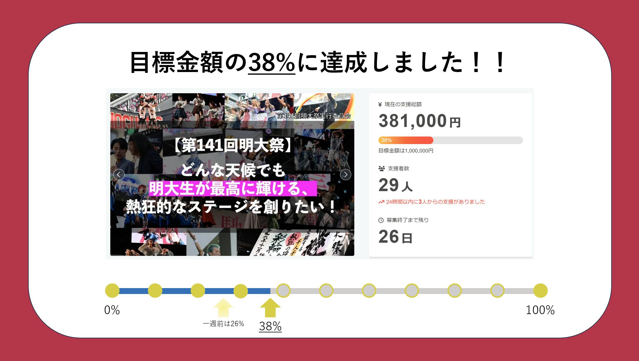 プロジェクト開始から2週間、皆様の温かいご支援のおかげで、目標金額の「38%」まで到達することができました!この一週間で新たに12%ものご支援をいただき、実行委員一同、心から感謝しております。