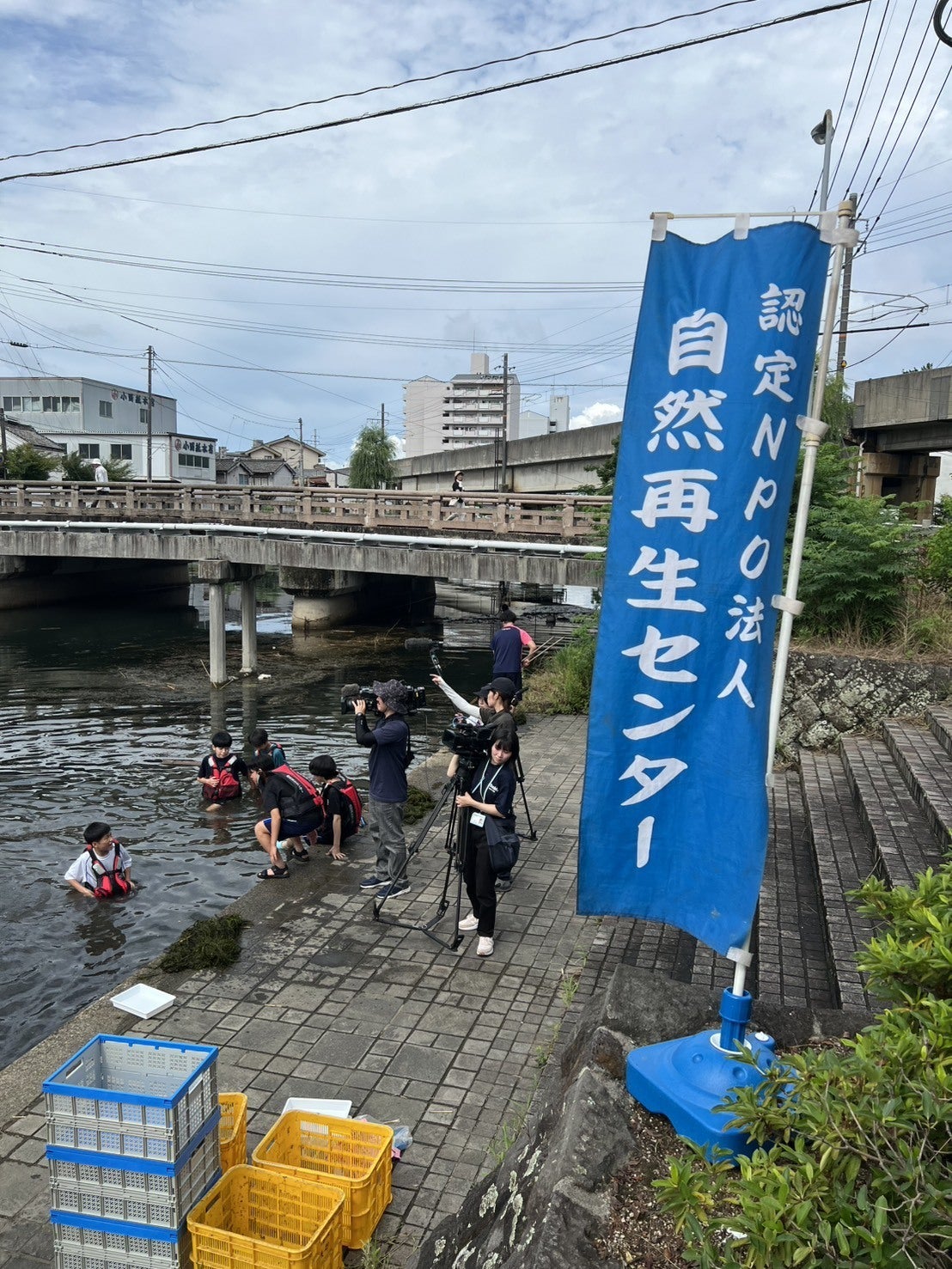 (写真は、水草刈りを取材していただいている様子です)