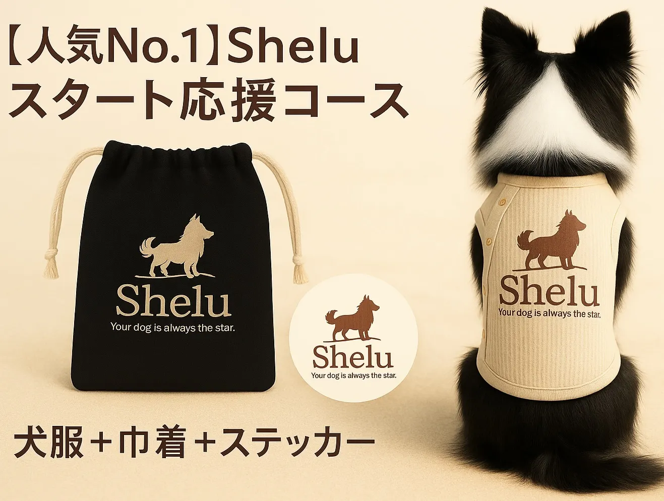 もふもふ体型でも可愛く着られるSheluの犬服に、ロゴ入り巾着とオリジナルステッカーがついた一番人気の3点セット。