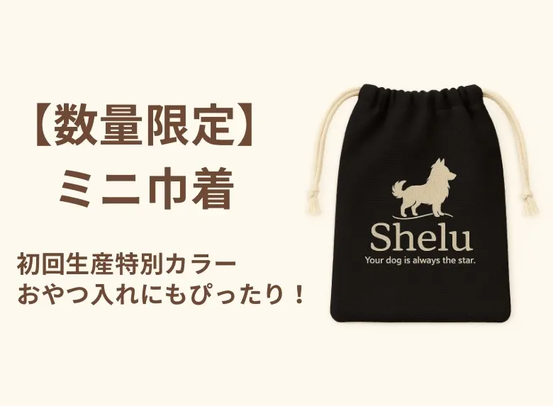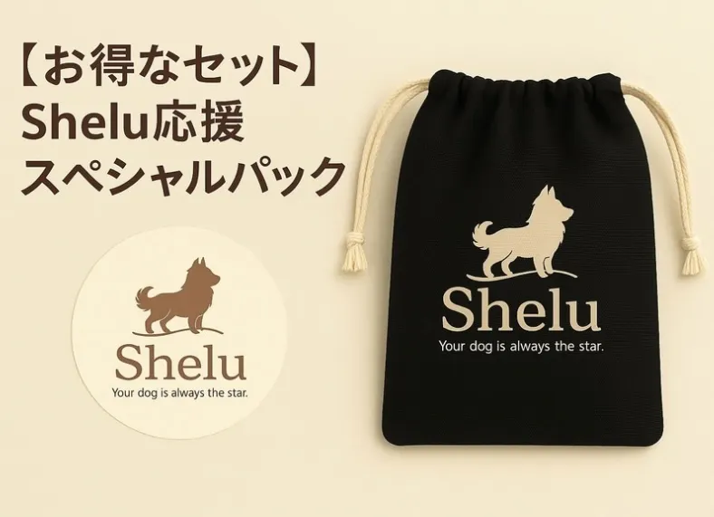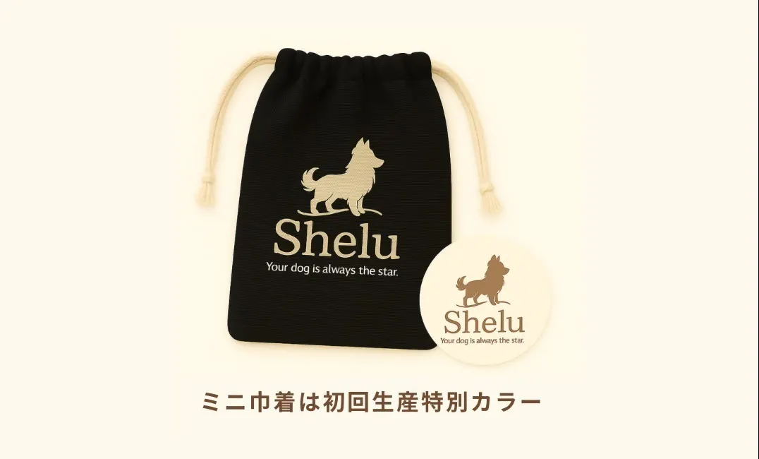 飼い主さんにも嬉しい、Sheluオリジナルのロゴ入り巾着とステッカーのセット。