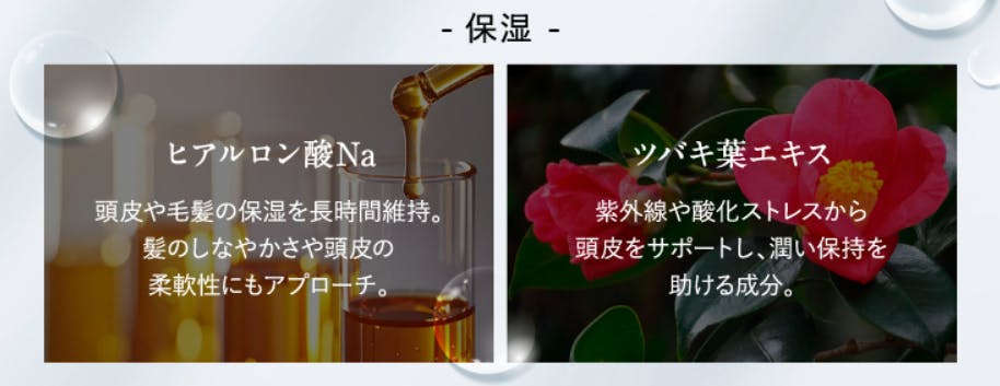 日本人の乾燥しやすい頭皮に寄り添った『うるおい成分』もふんだんに配合。よく耳にする「ヒアルロン酸」も、サポート成分として配合するほど贅沢な処方に。