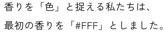 これは、 色の原点である「白」を表すカラーコード。私たちのはじまり、そして皆さまとこれから「iro」を作っていく。そんな意味を込めて「#FFF」としました。